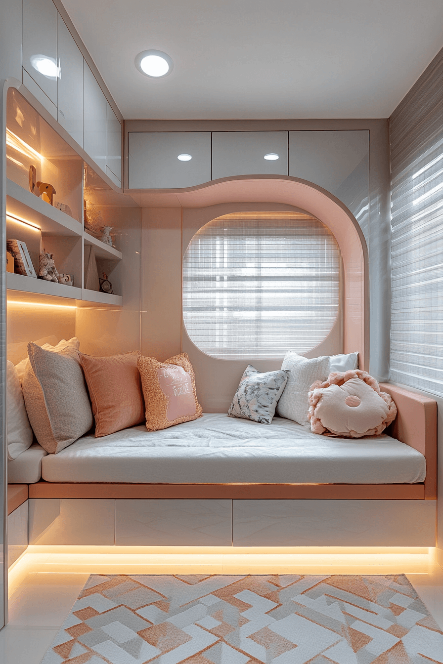 Compact yet luxurious, this designer nook features bespoke furniture with built-in desks, concealed drawers, and elevated beds to maximize functionality. Neutral color schemes paired with textured details maintain an elegant atmosphere that adapts as your child grows.