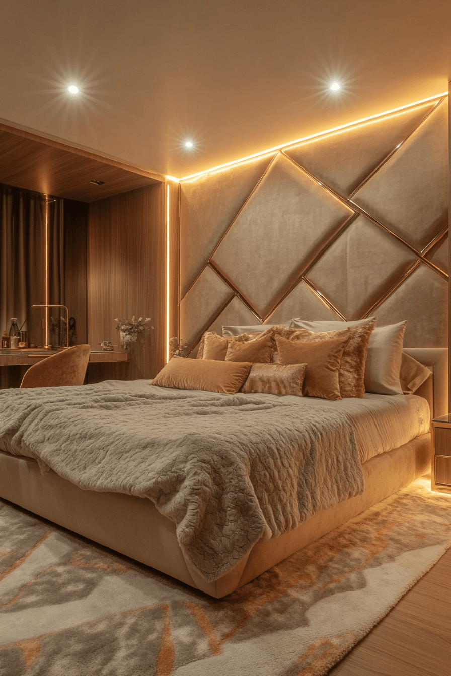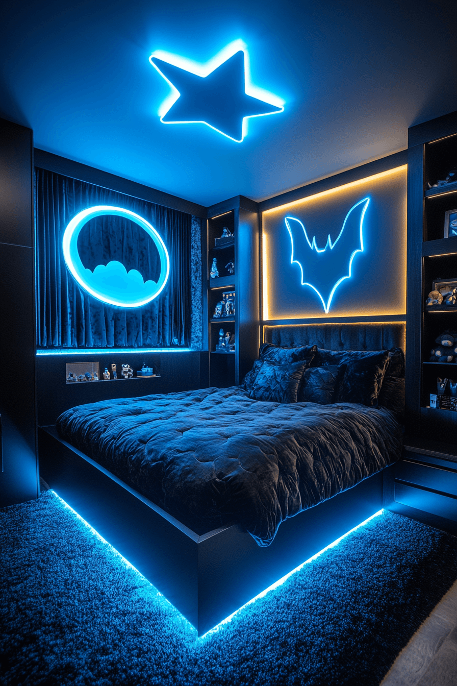 Dynamic LED accents, mirrored surfaces, and bold color pops energize this luxury bedroom. Blackout curtains ensure coziness, while neon signage adds a dramatic flair. It’s a perfect blend of edgy and elegant.
