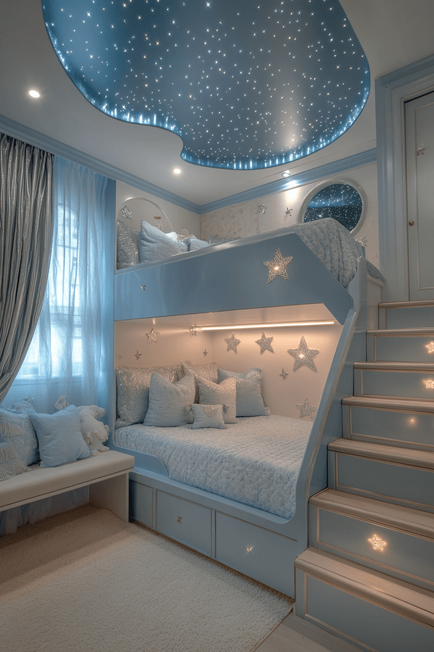 Featuring sleek geometric patterns, shimmering surfaces, and crystal embellishments, this diamond-inspired room sparkles with understated glamour. Neutral tones balance the design, while cleverly concealed storage keeps the space organized. Ideal for children who appreciate a subtle yet dazzling environment.