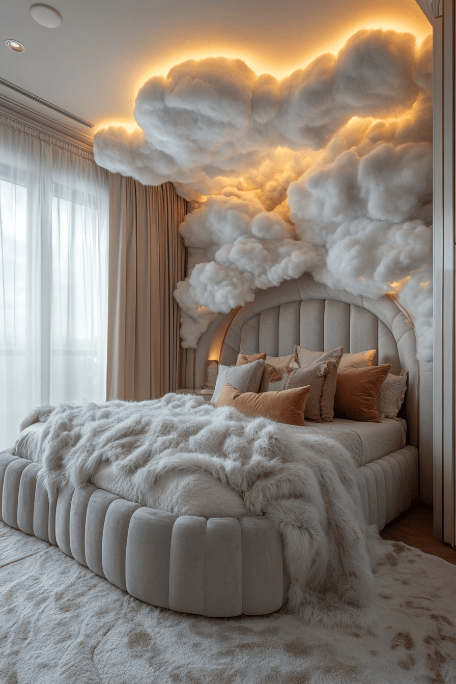 Soft fabrics, light color schemes, and airy furniture combine to create a tranquil bedroom inspired by clouds. Rounded furniture and floating shelves enhance the gentle, peaceful vibe-ideal for a calming retreat.