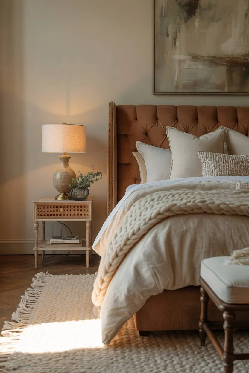 Bouclé textiles introduce rich texture and visual intrigue to brown bedrooms.