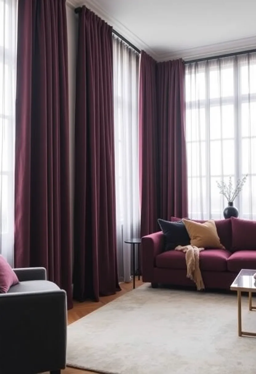 Using statement curtains also allows for versatility in styling your living room. To maintain a streamlined feel, pair your drapes with neutral or matching furnishings, allowing the curtains to truly shine as the focal point. Such as, a soft grey sofa juxtaposed against vibrant plum drapes can create a harmonious yet striking contrast.Don’t shy away from adding complementary throw pillows or an area rug that reflects the same color family, tying everything together beautifully. Here are a few quick tips to consider while selecting the perfect drapes: