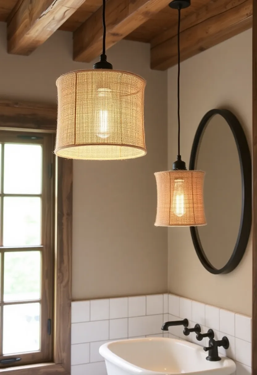 Woven Rattan: Introduce natural textures with a woven rattan pendant that gracefully diffuses light, enhancing the earthy vibe of your farmhouse bathroom