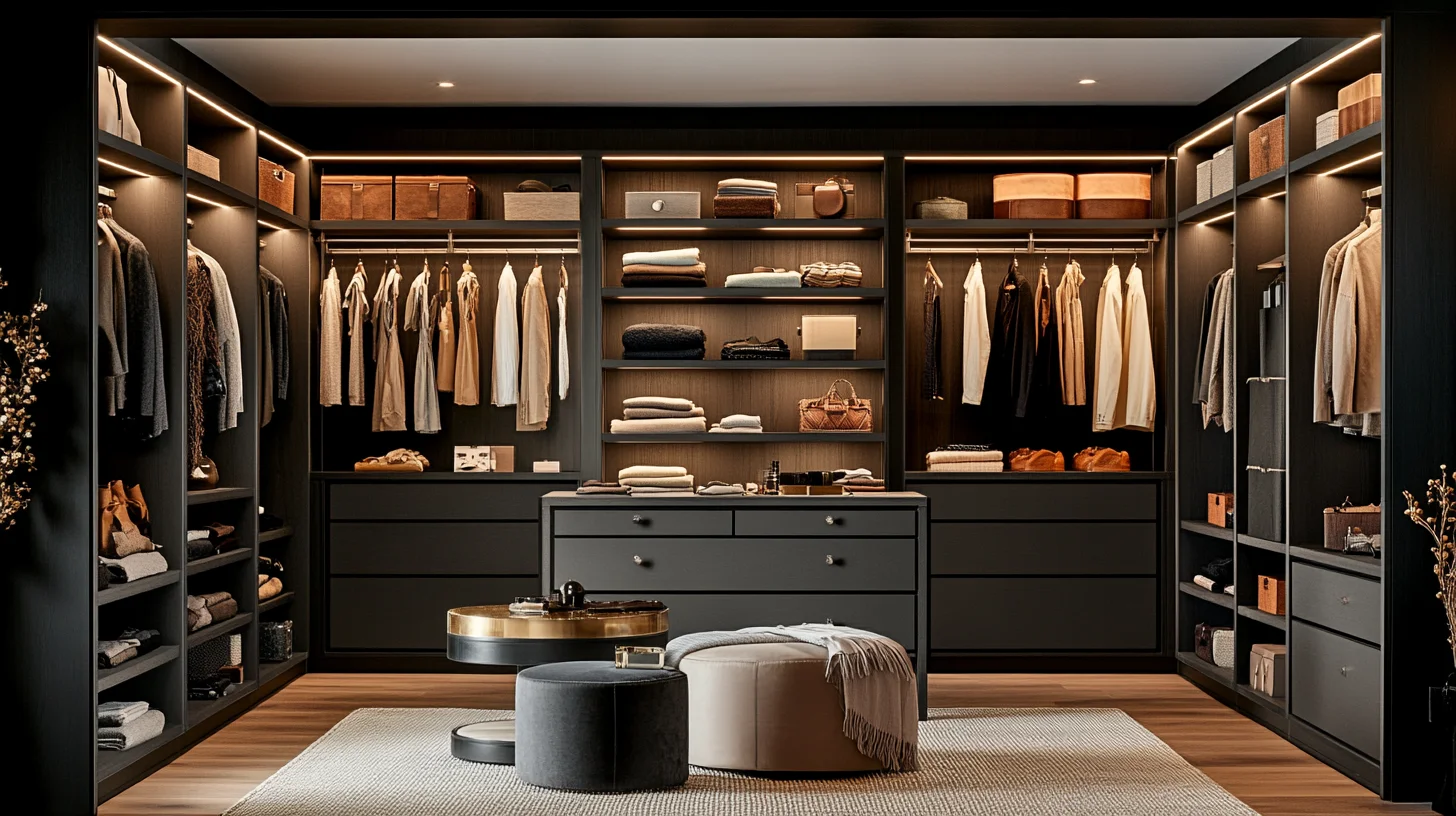 Dark wood cabinetry exudes warmth and timeless sophistication, creating a cozy yet upscale closet environment. When combined with brass or gold-toned lighting fixtures, the space feels inviting and elegant. This classic material choice remains a favorite for those seeking enduring style.