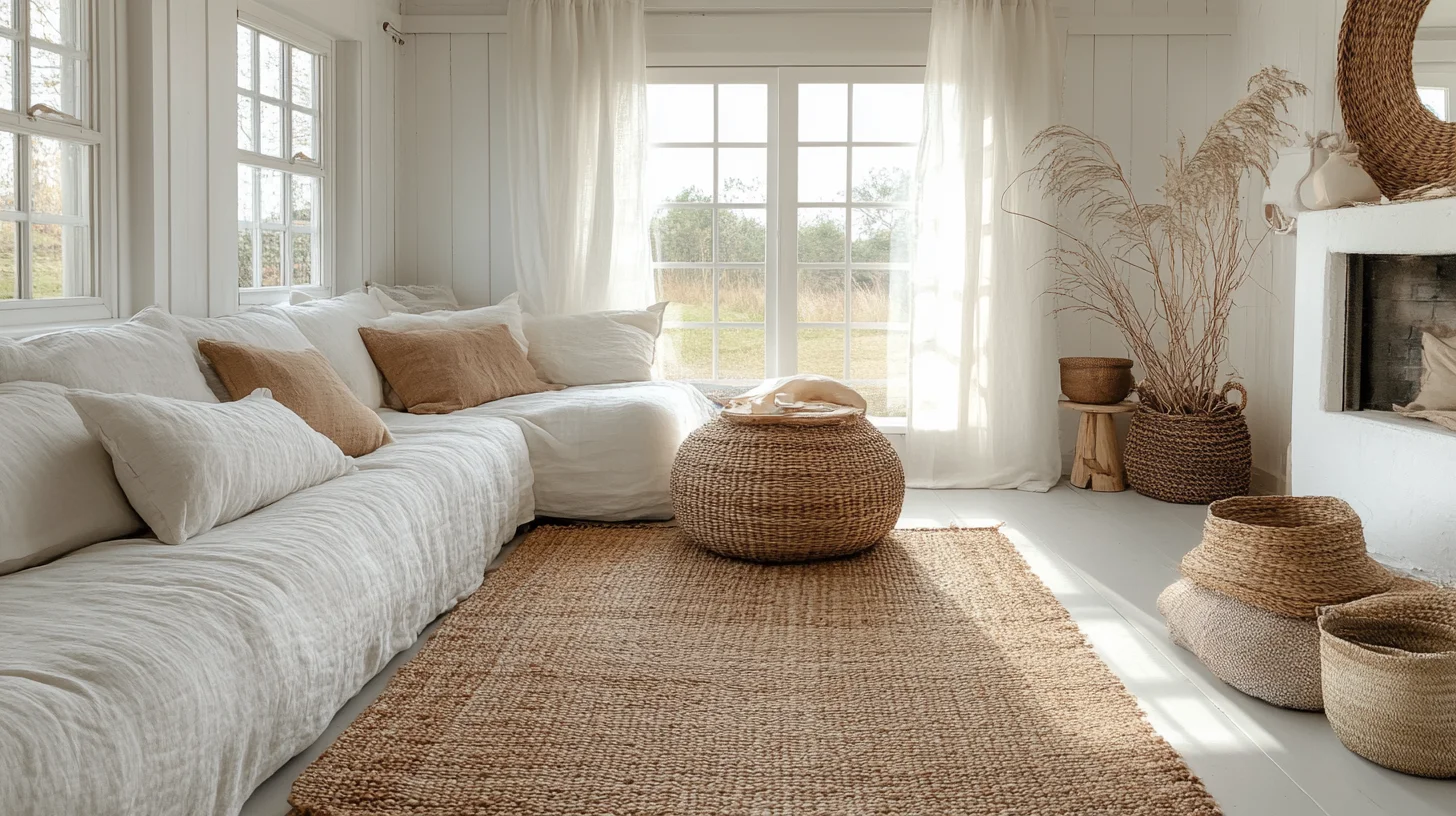 Embodying the essence of Nordic design, this cabin living room emphasizes simplicity and functionality. Light wood flooring, airy linen fabrics, and generous natural light create a serene atmosphere. The minimalist approach ensures every piece serves a purpose, fostering a calm and uncluttered environment that feels both luxurious and welcoming.