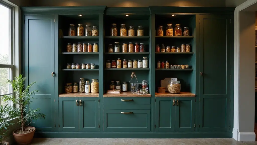 Charcoal shelves provide a sleek, modern contrast that highlights the forest green doors. This combination creates depth and sophistication, making your pantry both functional and visually striking.