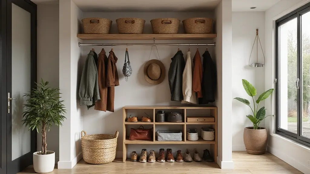 Hooks are a space-efficient way to hang coats, hats, bags, and scarves without sacrificing floor space. Wall-mounted or over-the-door hooks can be both practical and decorative.