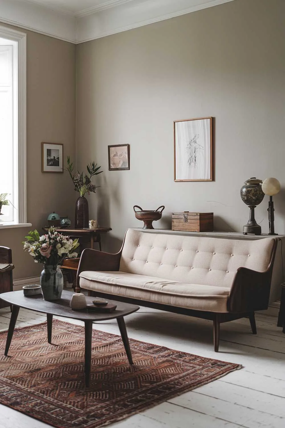 Beige seating offers comfort, while vintage lamps and artwork inject personality.