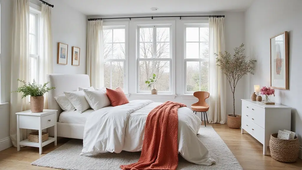 - White space balance: Keep large areas like walls, bedding, and curtains predominantly white to prevent visual overload.