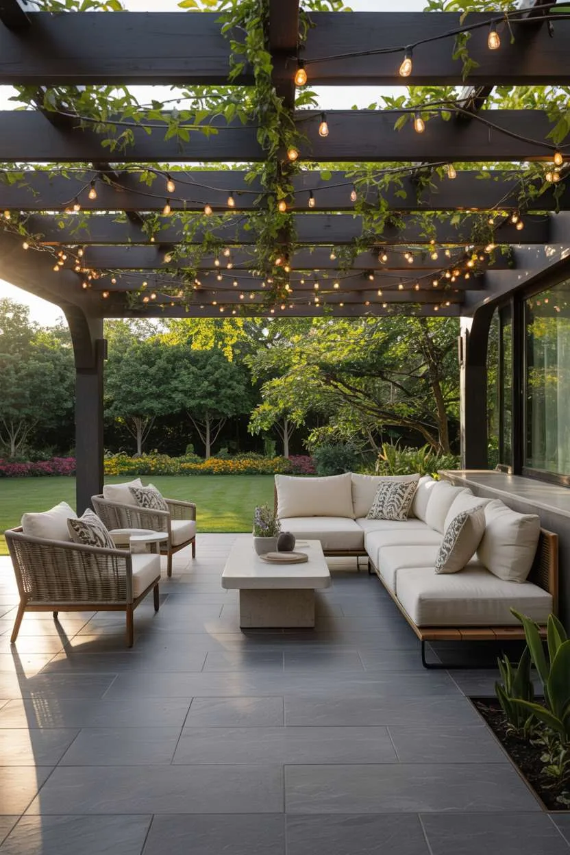 A light gray sectional with white cushions offers modern comfort, while a slatted wooden pergola supports string lights that add warmth and ambiance.