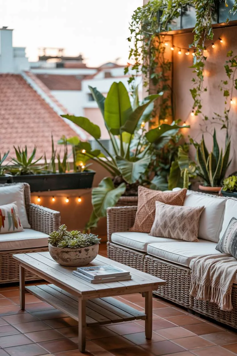 Trailing plants drape over railings, ambient lighting sets a warm mood, and inviting seating encourages long, leisurely afternoons with a favorite book or a steaming cup of tea.