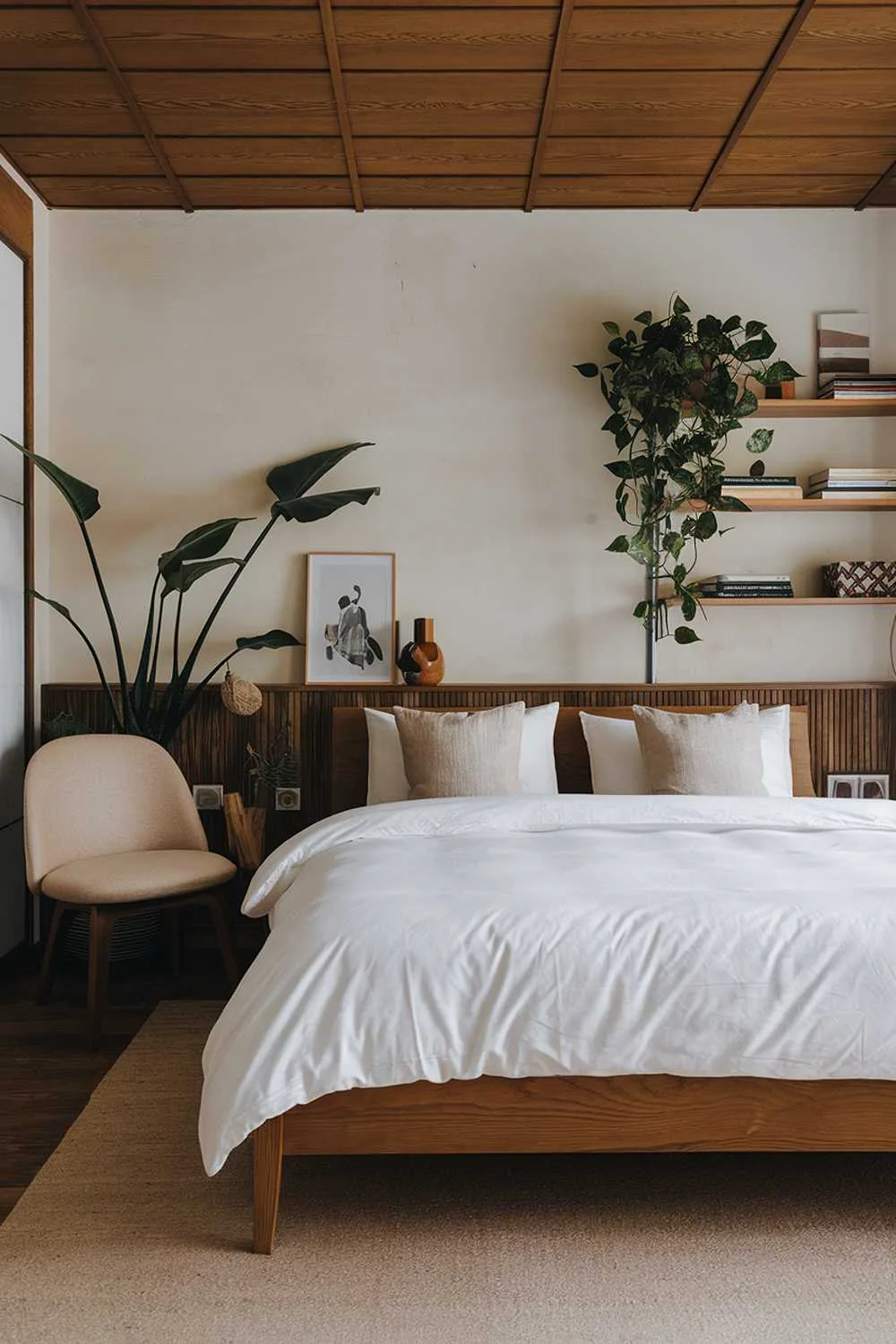 This bedroom exemplifies Japandi’s core: a queen-size bed framed by a natural wood headboard anchors the space.