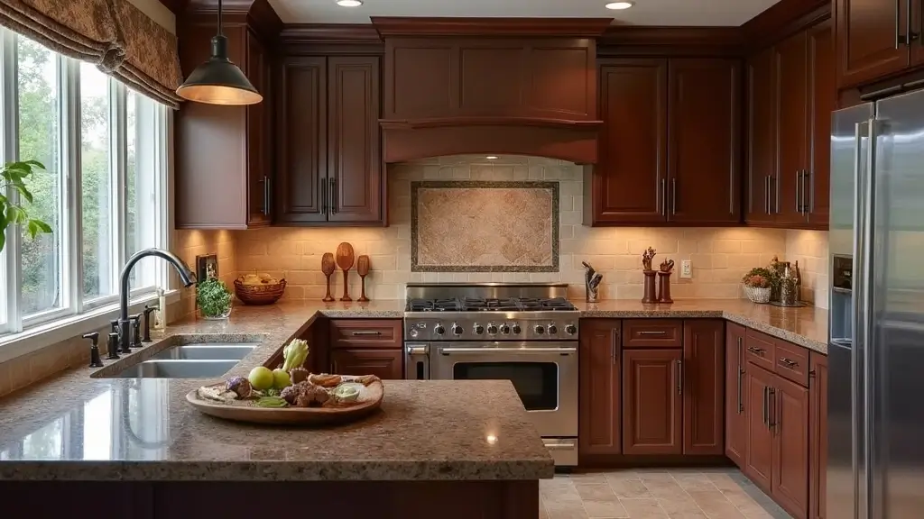 The plum-brown and cinnamon slate combination opens up a spectrum of complementary colors. Soft creams, muted whites, or gentle grays on walls can balance the richness of cabinetry and countertops, keeping the kitchen light and airy.