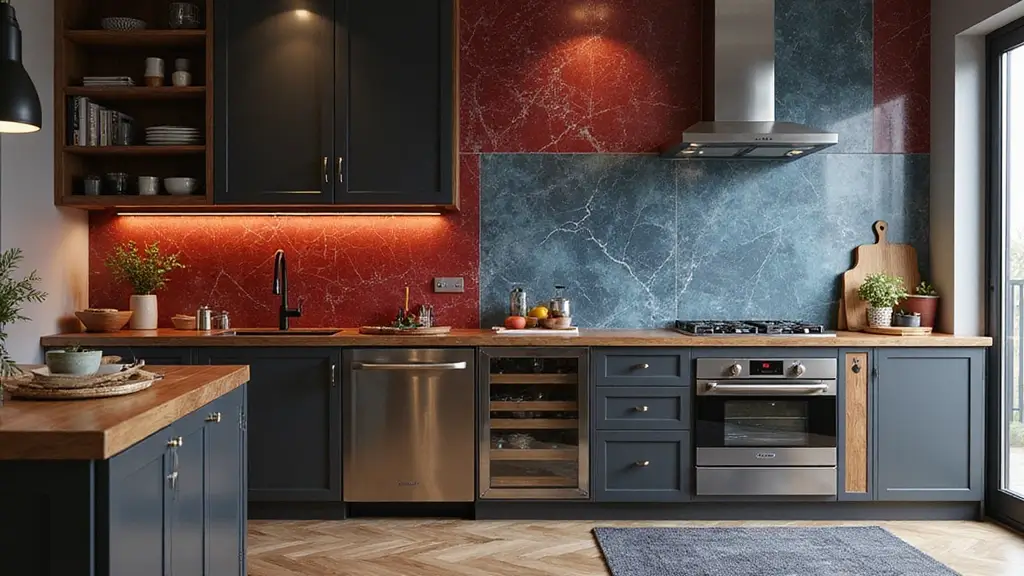 For a backsplash that’s uniquely yours, mix and match deep red and mysterious blue tiles in various shapes and finishes. This playful approach allows for personal expression and a vibrant kitchen atmosphere.