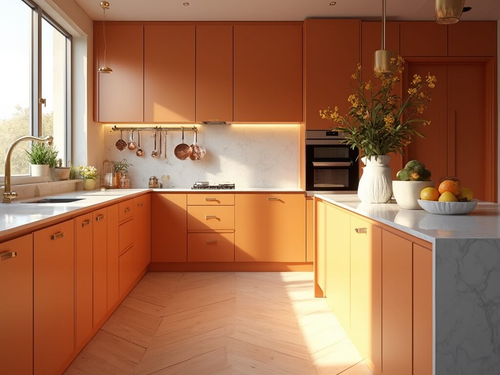 Picture stepping into a kitchen where burnt orange cabinets envelop the room in warmth, complemented by gleaming stainless steel appliances and sunlit marble countertops. This is more than a kitchen-it’s a vibrant lifestyle statement.