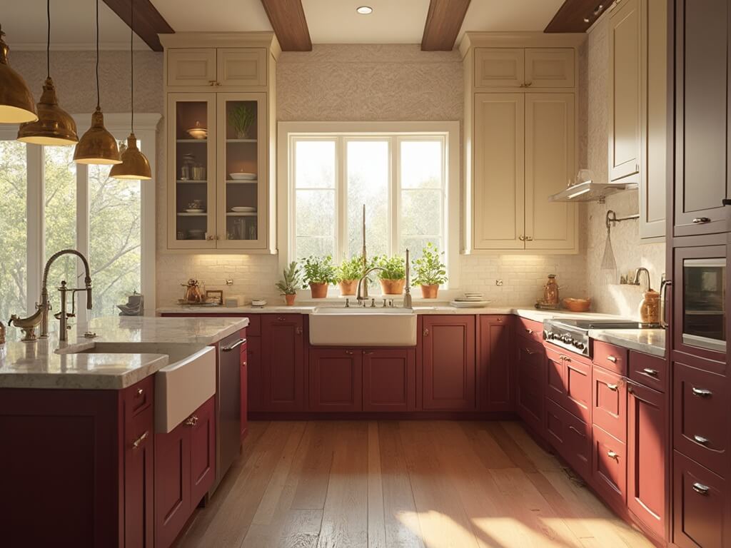 To amplify the beauty of your burgundy cabinets, consider integrating:
