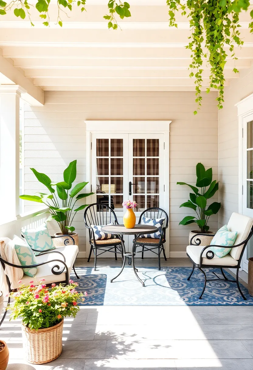 Bright and Airy Patio space with Sleek White Bistro Furniture Surrounded by Colorful Hanging Planters