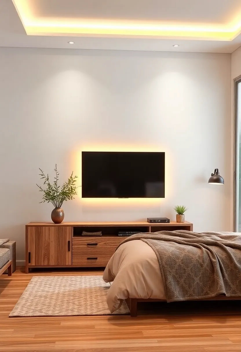 To enhance the tranquil atmosphere of your rustic bedroom, consider incorporating warm lighting around your TV unit. Soft, ambient light can transform the space, creating a cozy feel that encourages relaxation. By using warm-toned bulbs or LED strip lights, you can softly illuminate the area, reducing the harshness of direct lighting. This approach not only highlights the beauty of your TV unit but also creates a welcoming glow that makes the entire room feel more inviting.