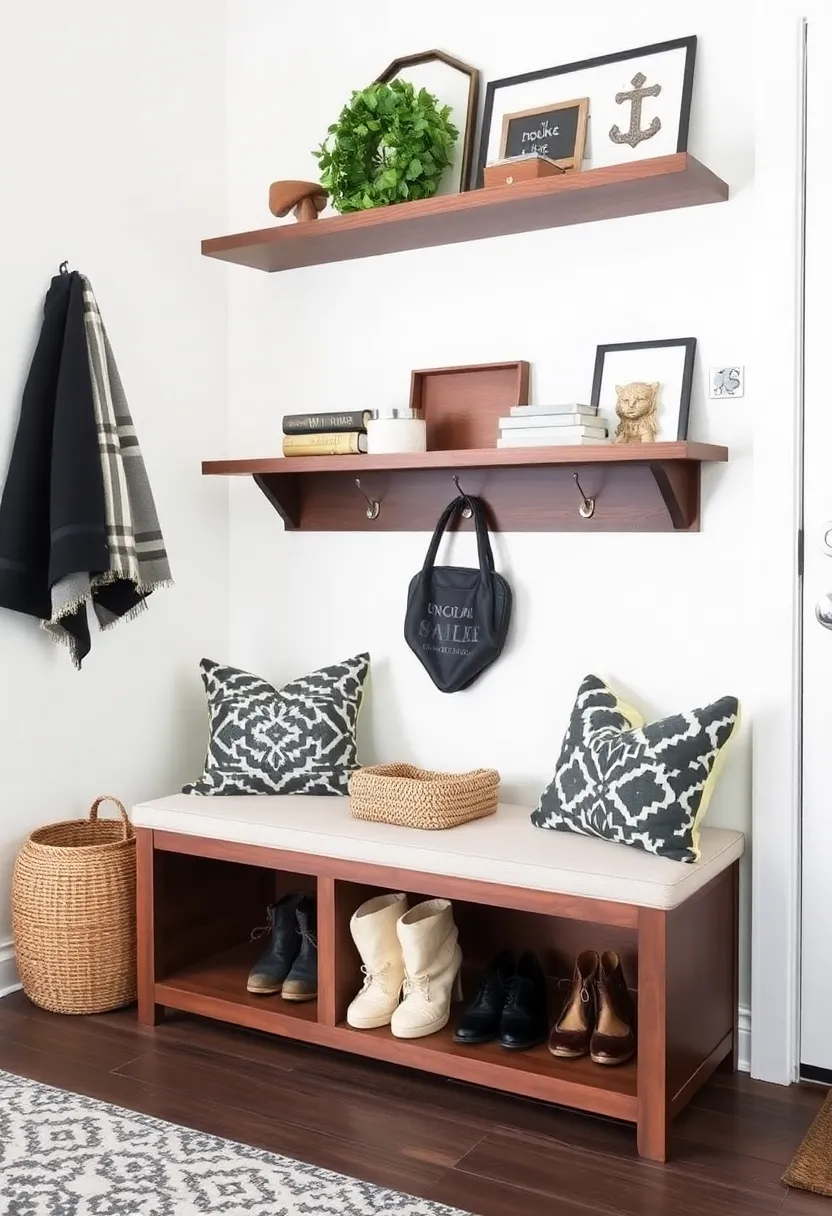 Consider adding a storage bench with hidden compartments for shoes or winter accessories. This multi-purpose piece of furniture not only provides a place to sit while putting on or taking off shoes, but also serves as a discreet storage solution for items that tend to clutter the entryway.