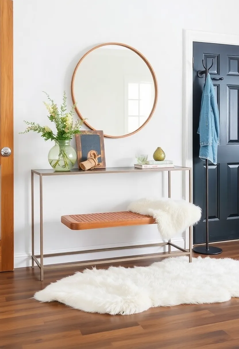 Consider pairing a sleek metal console table with a fluffy sheepskin rug for a balanced contrast of textures. The cool, smooth surface of the table will be offset by the soft, plush feel of the rug, creating an inviting and dynamic entryway.