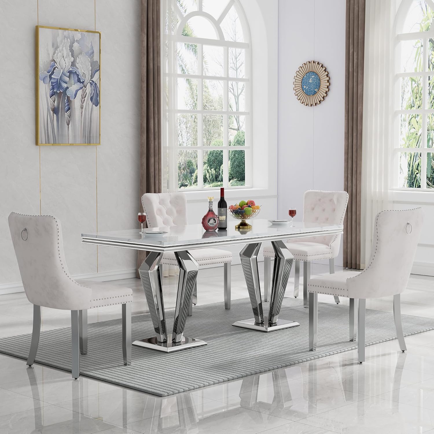 Our first impressions highlight a beautifully balanced combination of faux marble and stainless steel that immediately elevates any dining space with its modern charm. The rectangular tabletop features a smooth 0.71-inch thick marble-printed MDF surface that’s not only visually striking but also practical, resisting scratches and stains with ease. Complementing the table, the high-back accent chairs wrapped in velvet provide a sleek yet inviting silhouette, thoughtfully designed with ergonomic curves that support comfort during extended meals. The mirrored stainless steel pedestal base brings a reflective shine that amplifies the room’s light and ensures rock-solid stability without compromising on style.