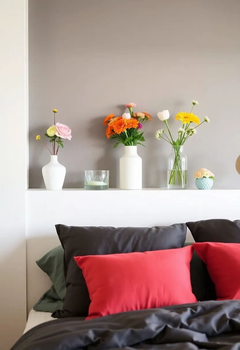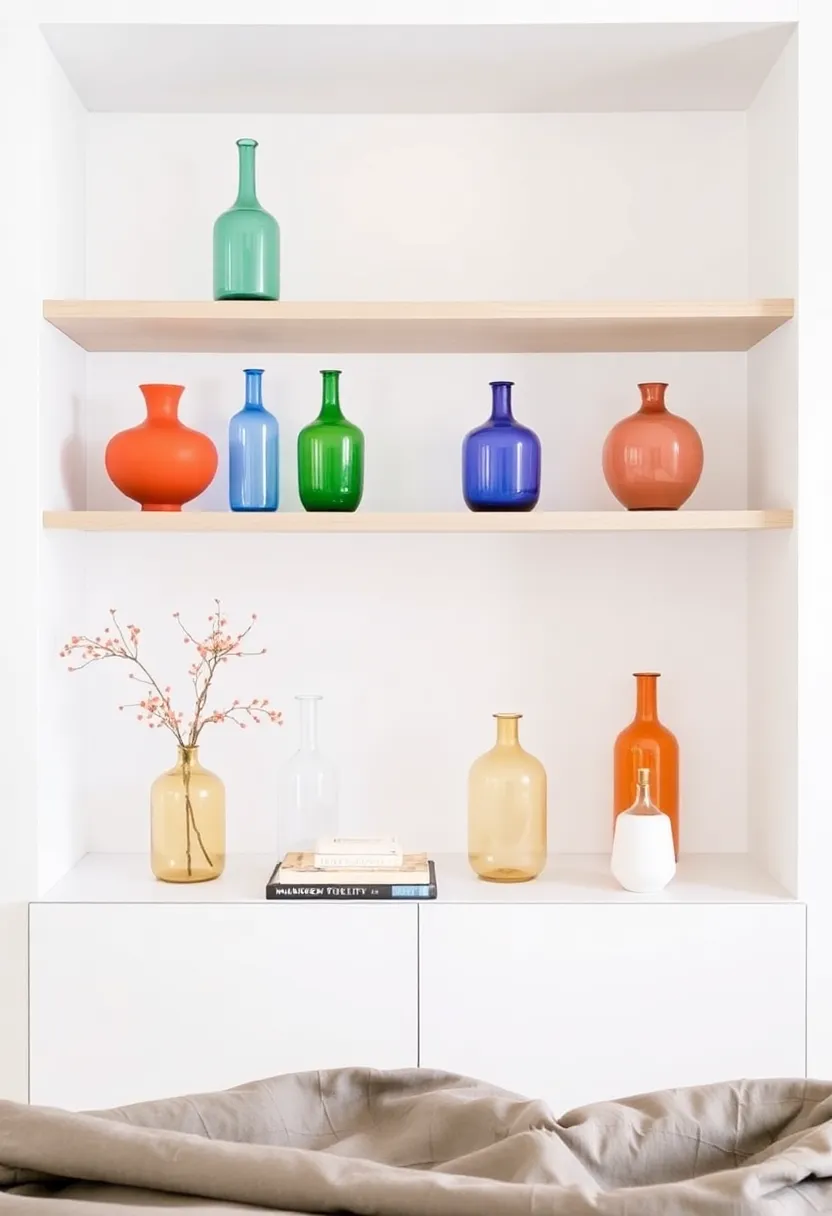 Transform your bedroom shelf into a lively focal point with vibrant glass vases that not only hold flowers but also add bursts of color and personality to your space. Choose vases in various shapes and sizes to create a dynamic arrangement; as a notable example, pair slender necks with round bodies. This contrast adds visual interest,making your decor stand out. Consider using bold colors like emerald green, sapphire blue, or fiery red to invite energy into your room. To ensure harmony, select a color palette that complements your existing decor, or go for an eclectic mix that reflects your personal style.