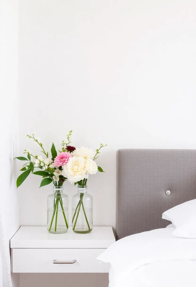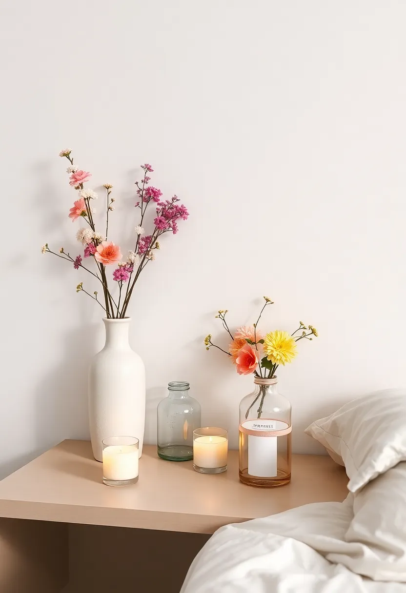 Transforming your bedroom shelf into a botanical focal point is all about thinking outside the box. Consider using unconventional containers that juxtapose the soft curves of flowers with unexpected materials and shapes. As a notable example, repurposed tin cans can add a rustic charm to your arrangements. To elevate this idea, paint them in a matte finish or wrap them in jute twine for a more cohesive look. Additionally, old glass bottles, whether vintage colored ones or sleek modern designs, can offer a unique aesthetic that complements the blooms. Try clustering bottles of varying heights for a visually appealing display that draws the eye.