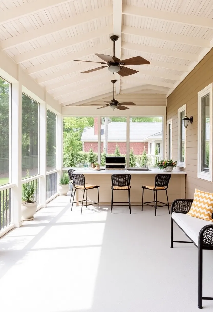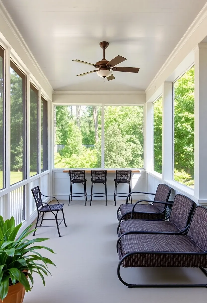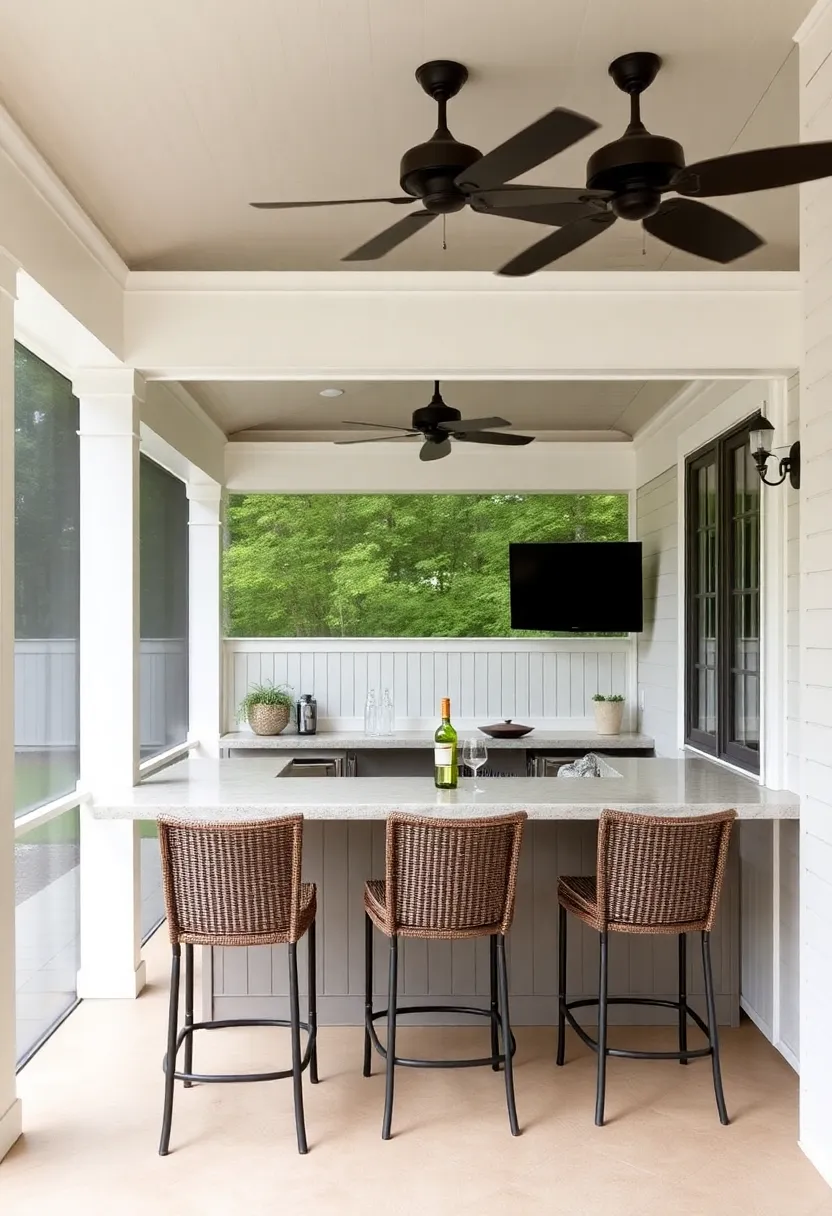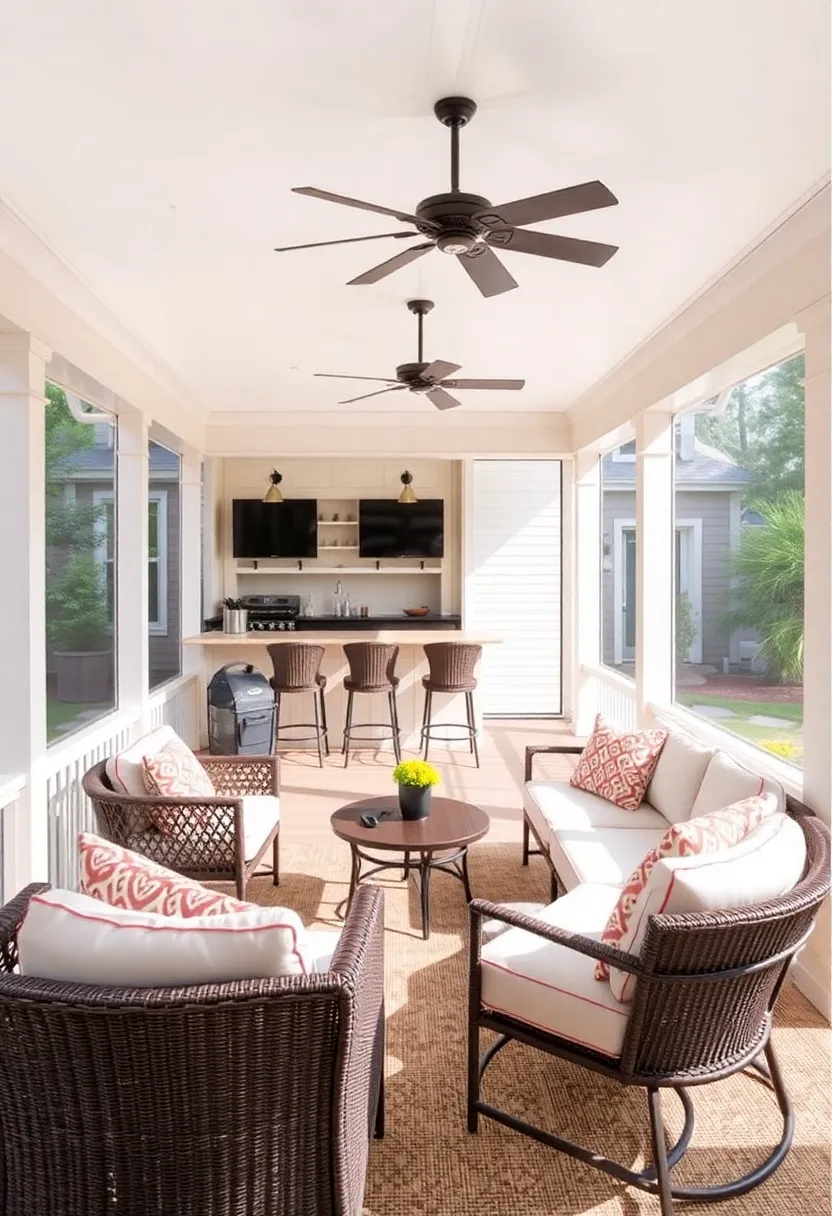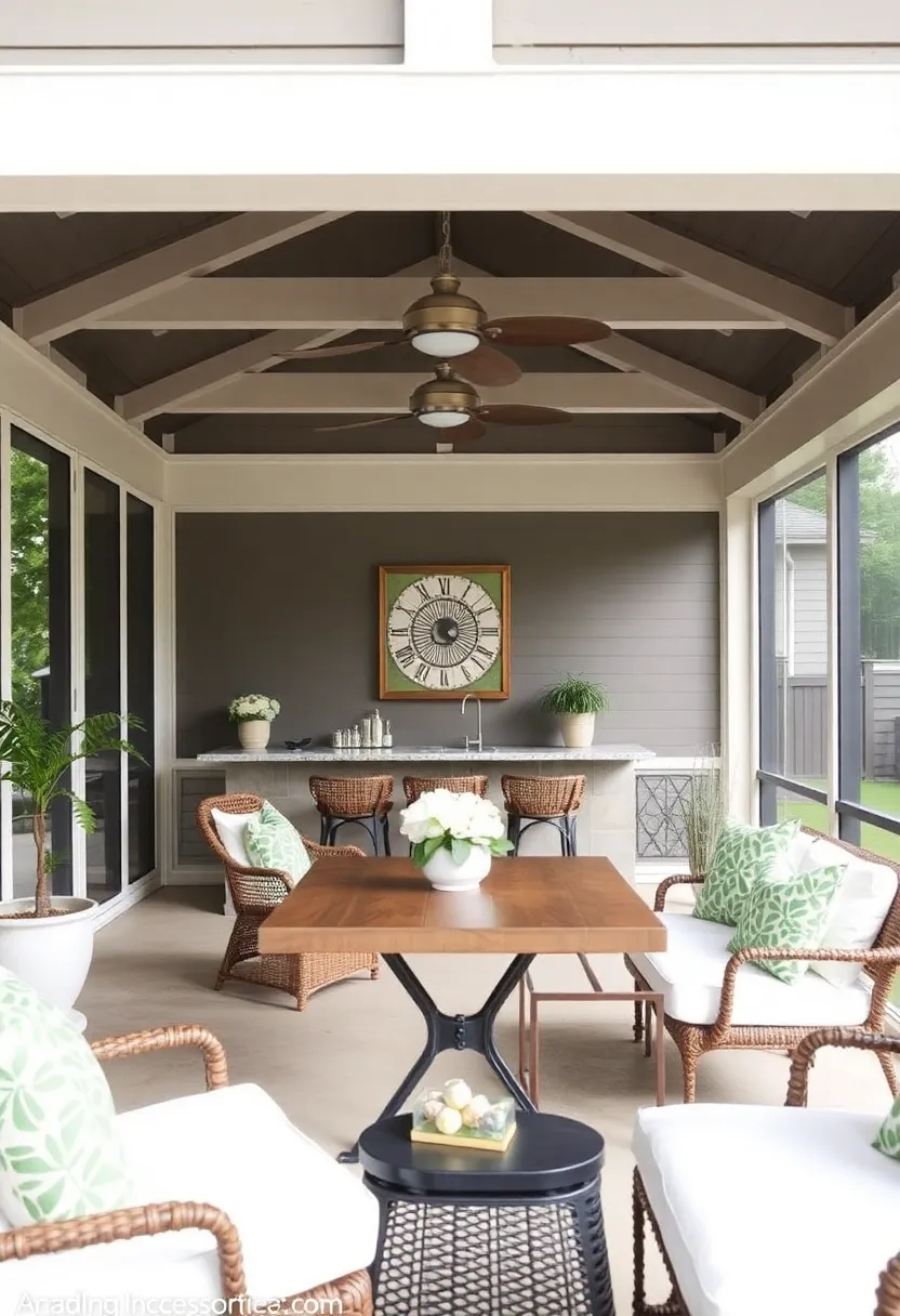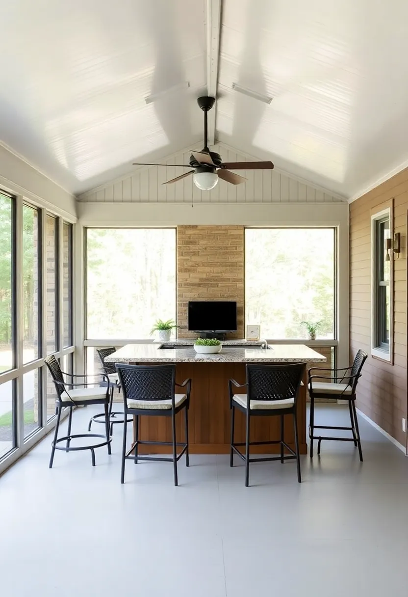 To elevate your bar area, choose a cohesive color palette that complements the overall design of your screened porch. Incorporating a small fridge for beverages and a stylish countertop will ensure that your guests feel catered to. Here are a few essential design elements that can enhance your bar area: