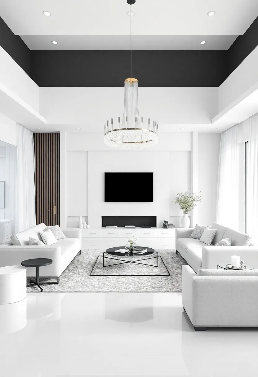 Incorporate distinctive decorative elements to elevate the aesthetic further. Visual interest can be achieved through sculptural pieces, such as a stunning white marble coffee table or a bold, contemporary chandelier. Don’t overlook the power of greenery; a few strategically placed white or neutral planters containing lush indoor plants can infuse life into your design while maintaining the overall color palette.To enhance the luxurious feel, use artwork and accents in varying shades of white, with a few metallic touches—gold or silver frames can bring a hint of glimmer to your immaculate setting. This thoughtful curation will assure that each aspect of your living room speaks to an opulent monochrome dream.