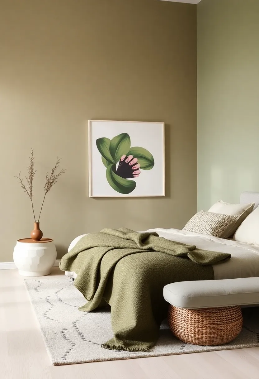 To enhance this theme further, consider natural materials in your decor. Wood accents, like a rustic bed frame or side tables, work beautifully with this palette, grounding the overall look. Adding greenery in the form of potted plants or hanging ferns can also establish a refreshing connection to the outdoors. For a transformative touch, use welcoming light fixtures in warm tones or delicate golds to accentuate the warm whites and deepen the olive hues. Here are some ideas for incorporating these colors: