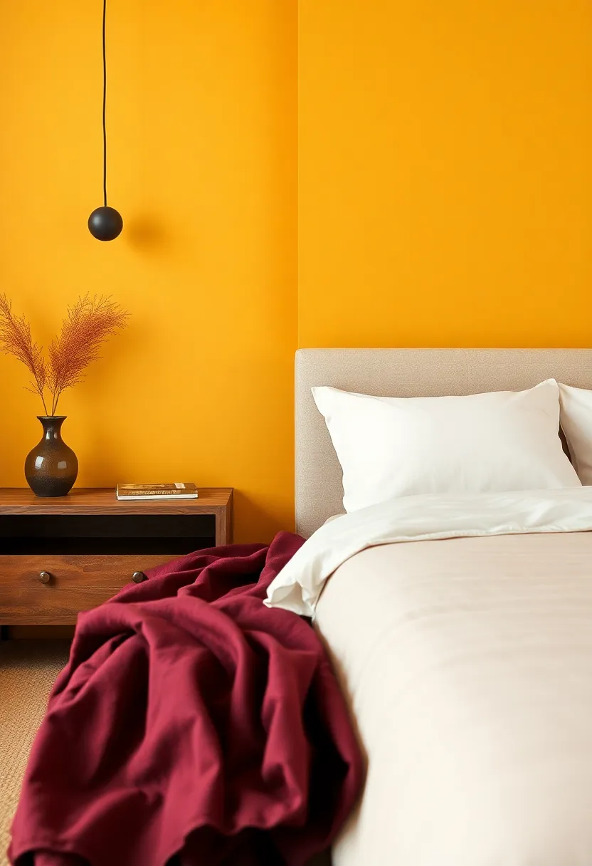 - Bedding: Choose a duvet or quilt in deep burgundy, complemented by golden yellow accent pillows.
