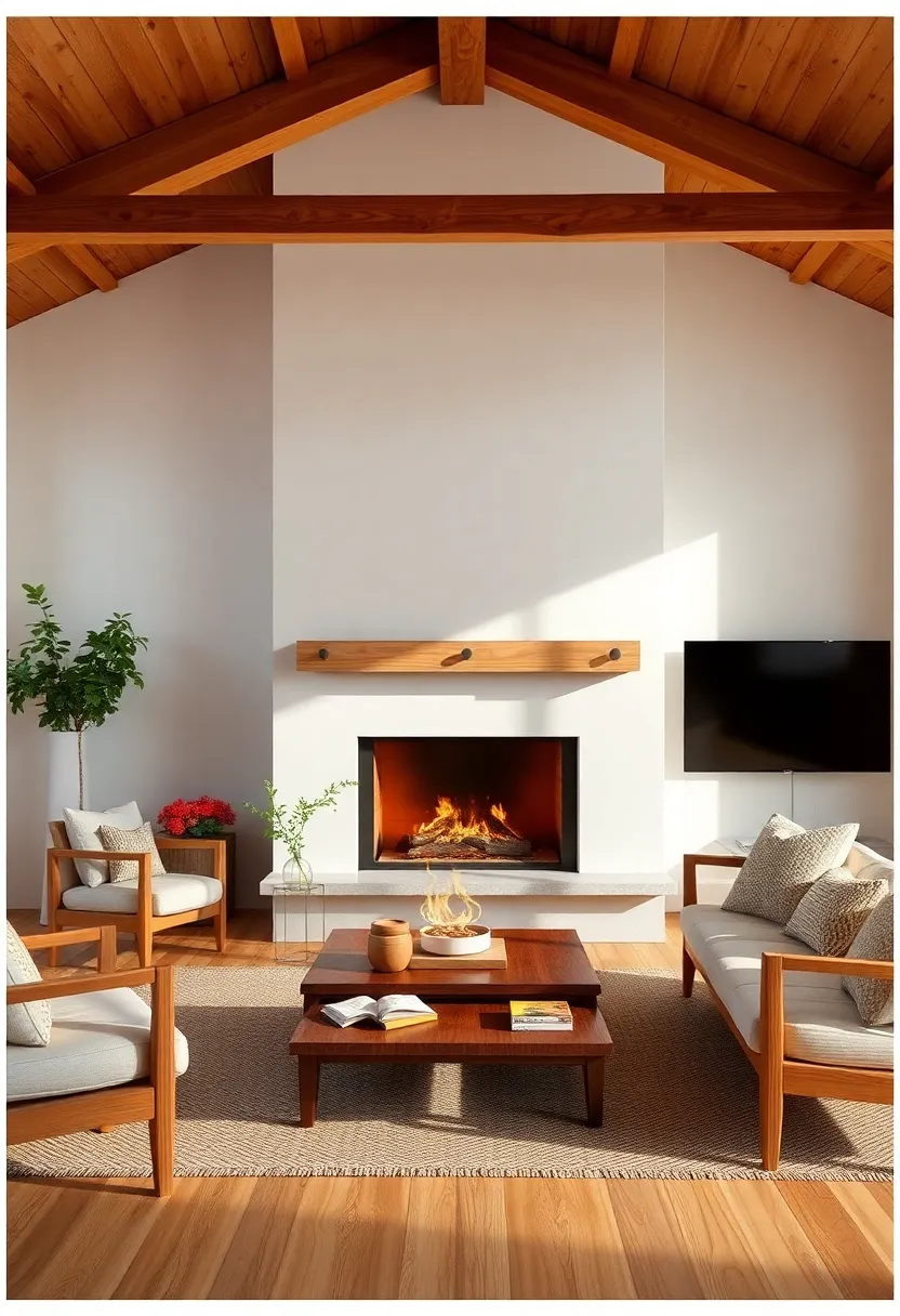 By thoughtfully blending these artistic elements with the natural textures of wood and the inviting essence of your fireplace, you create a living room that is not only cozy but also visually captivating.