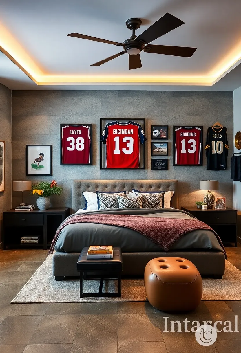 The Bold Impact of Framed Jerseys Creating a Central Statement Wall in a Modern Sports-Themed bedroom