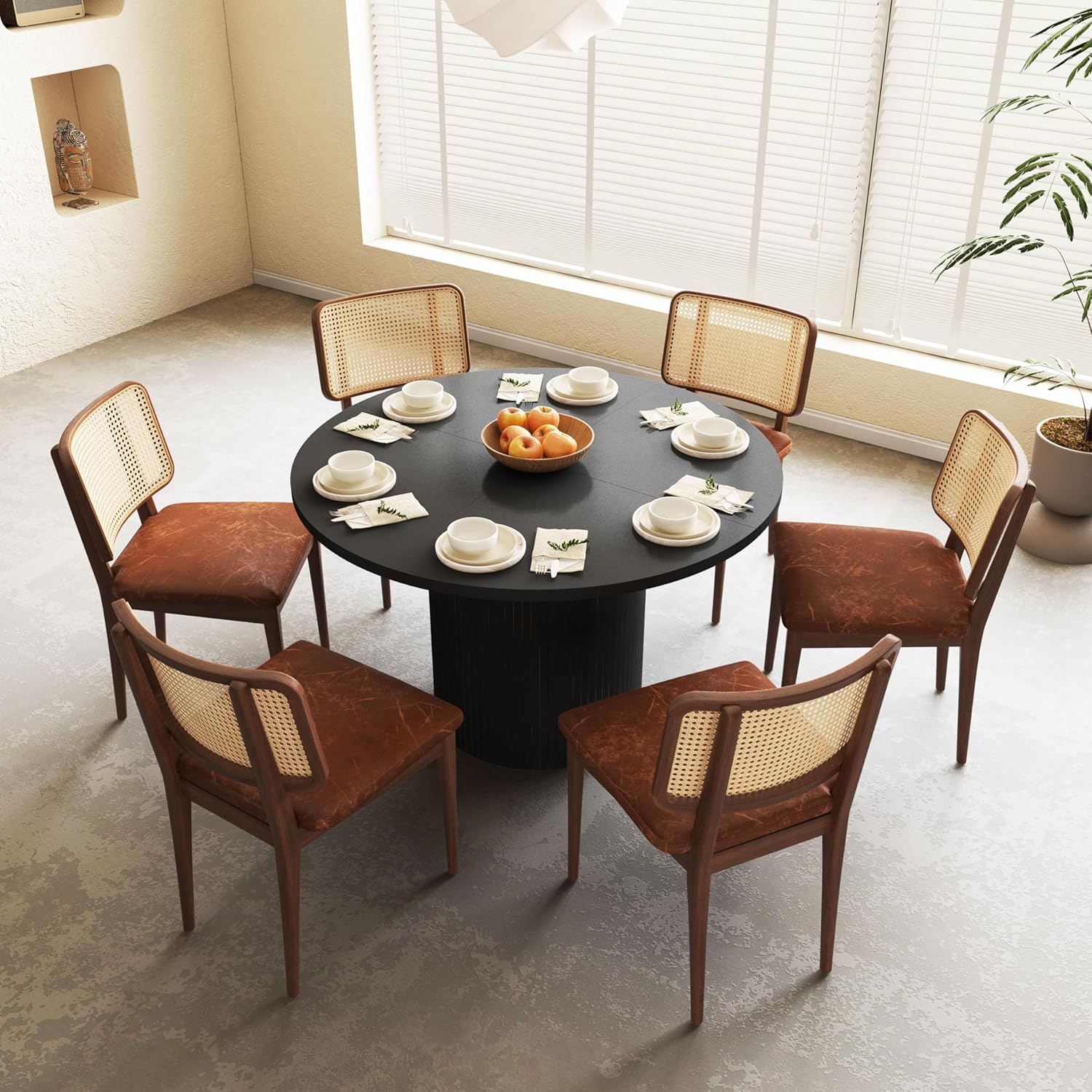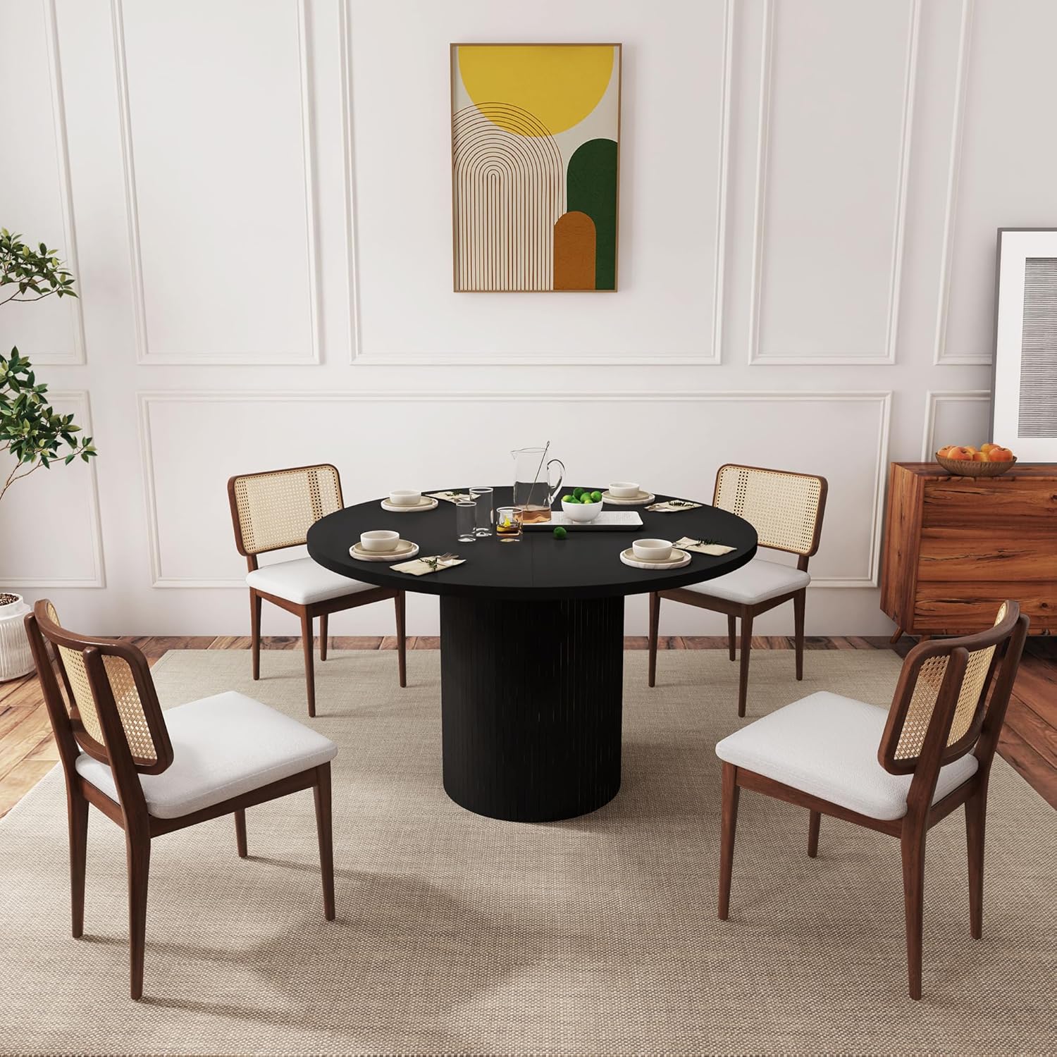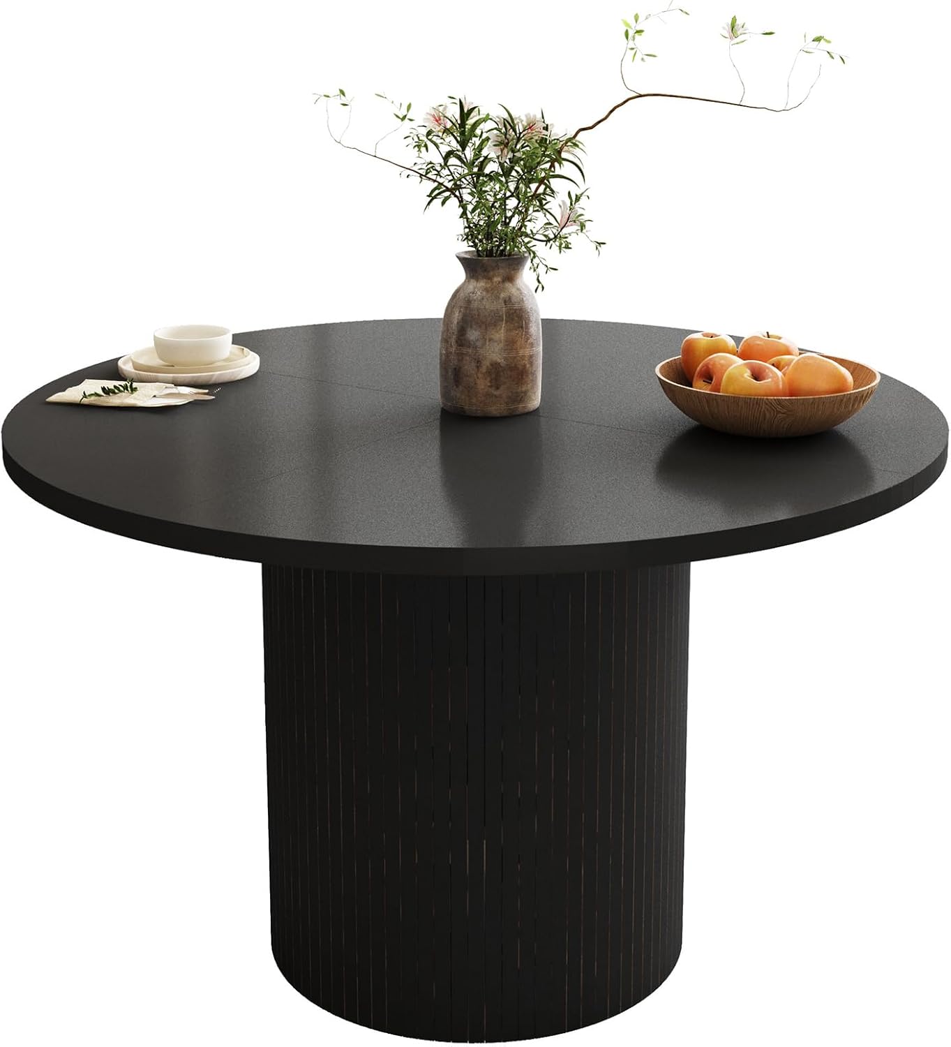Bringing a touch of rustic charm and modern simplicity,this round dining table perfectly elevates the heart of our home.Its spacious 47-inch diameter allows us to comfortably gather up to six people,making every meal feel like a special occasion. The farmhouse-inspired fluted design adds subtle elegance without overpowering the room, striking a harmonious balance between casual warmth and refined style. The black finish creates a bold contrast that ties together our kitchen and living space, adding depth and character to both areas.