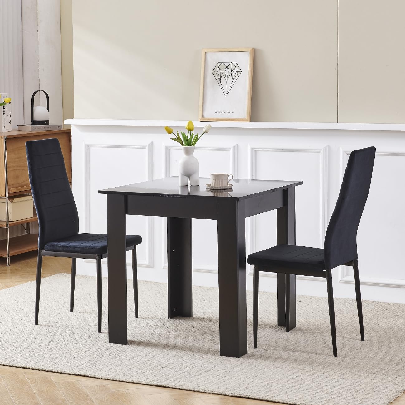 This compact square dining table perfectly balances modern aesthetics with practical design, making it a versatile addition to various spaces. Its thickened MDF tabletop paired with robust wooden legs ensures remarkable stability while adding a warm, natural touch to any surroundings. The minimalist black finish complements both contemporary and classic interiors, allowing it to blend seamlessly into kitchens, dining rooms, or cozy café corners alike.Its size is optimized for intimate gatherings, comfortably accommodating 2 to 4 people without overwhelming smaller rooms.