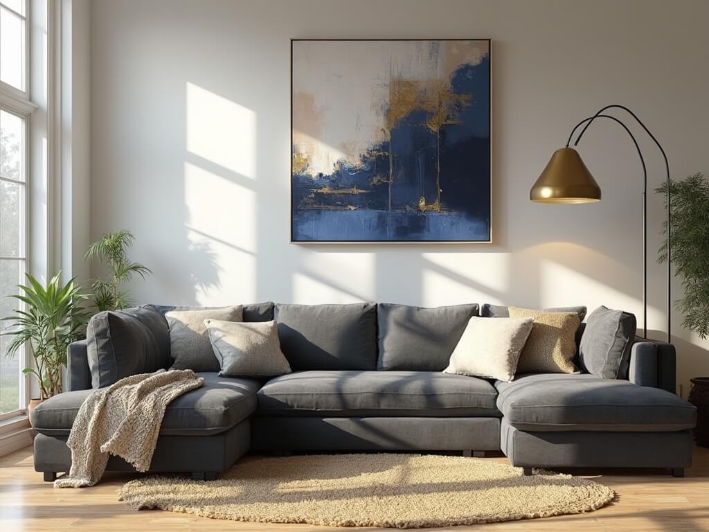 Contemporary, sunlit living room with high ceilings, floor-to-ceiling windows, plush charcoal grey sectional against a white wall, adorned with textured pillows and a large blue and gold abstract canvas hanging above, with a natural jute rug and brass floor lamp in the foreground.