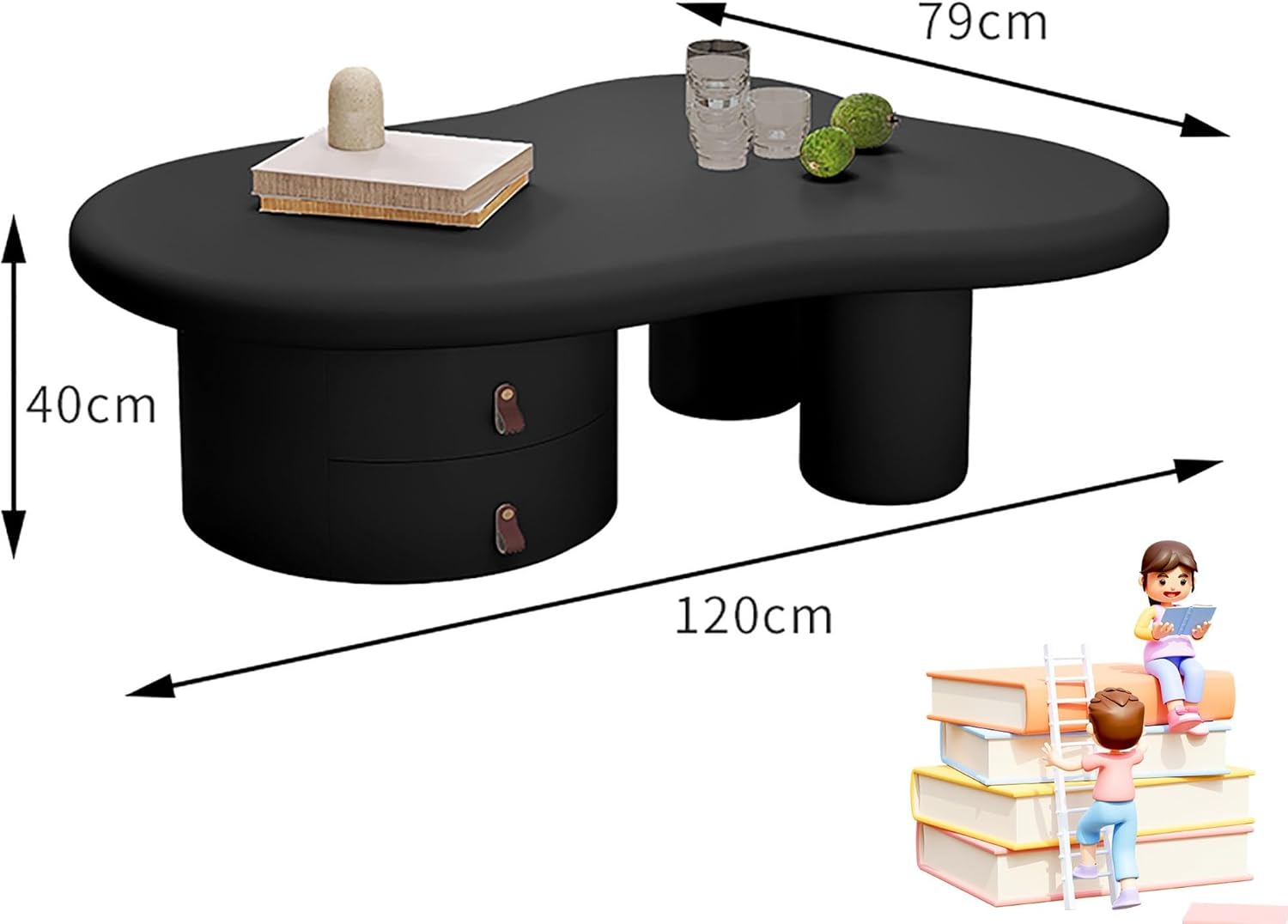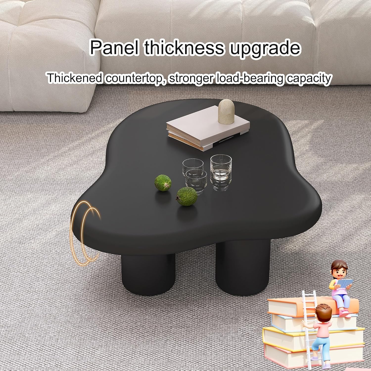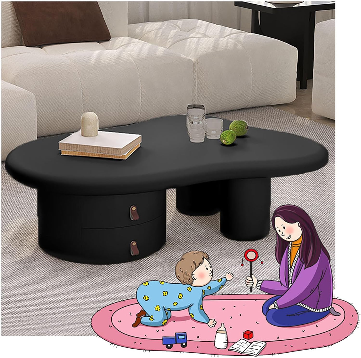 To highlight the charming, modern curves of this coffee table, consider surrounding it with soft, neutral-toned furnishings that allow its unique cloud-like silhouette to shine. Pairing it with plush throws, textured cushions, or subtle geometric rugs can introduce a harmonious contrast while maintaining an airy, inviting atmosphere. The elegant black finish and thickened legs work beautifully against light wooden floors or minimalist carpets, creating a balanced interplay between boldness and subtlety. For a refined touch, add metallic accents such as gold or matte brass vases and candle holders, which enhance the table’s contemporary flair without overpowering its gentle form.