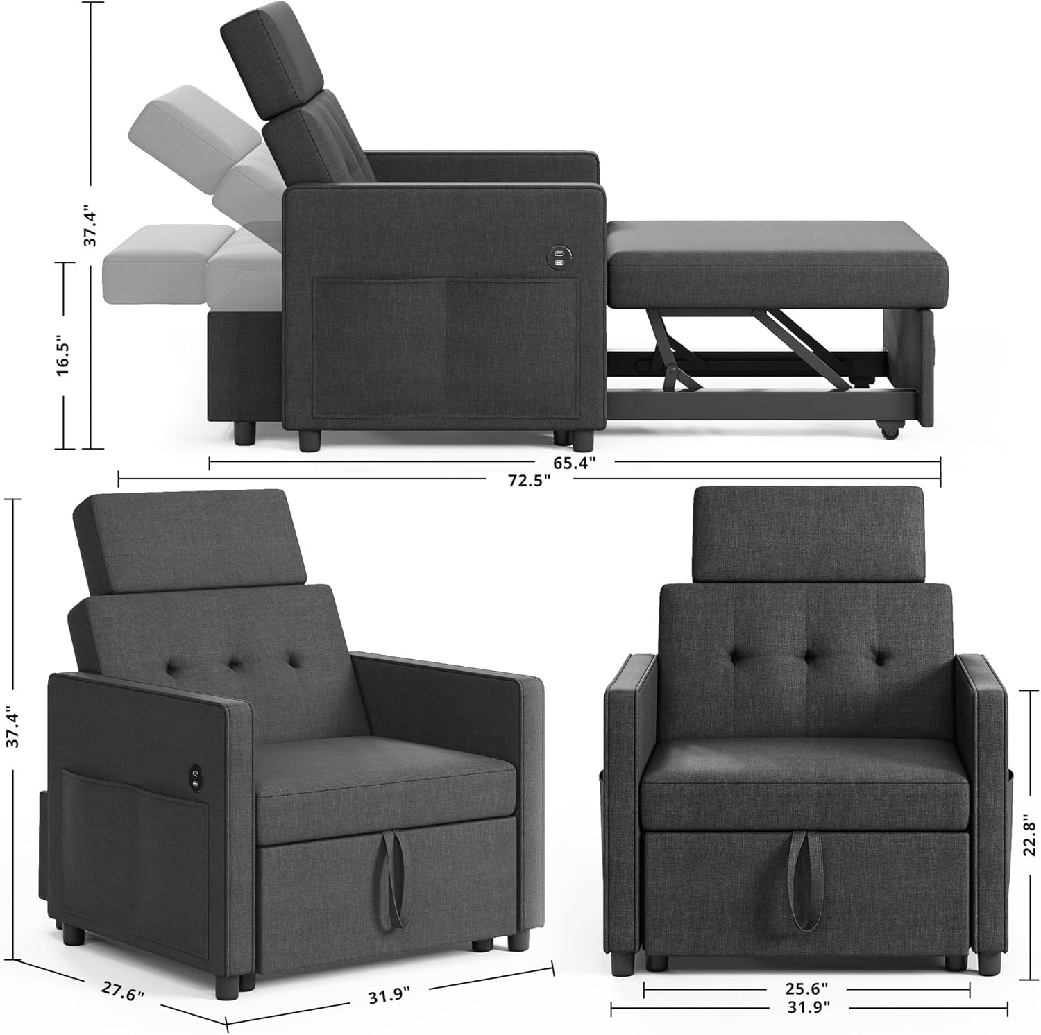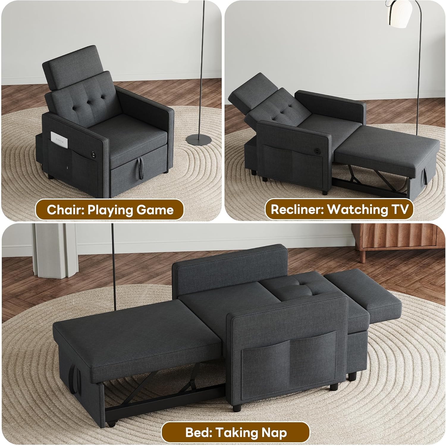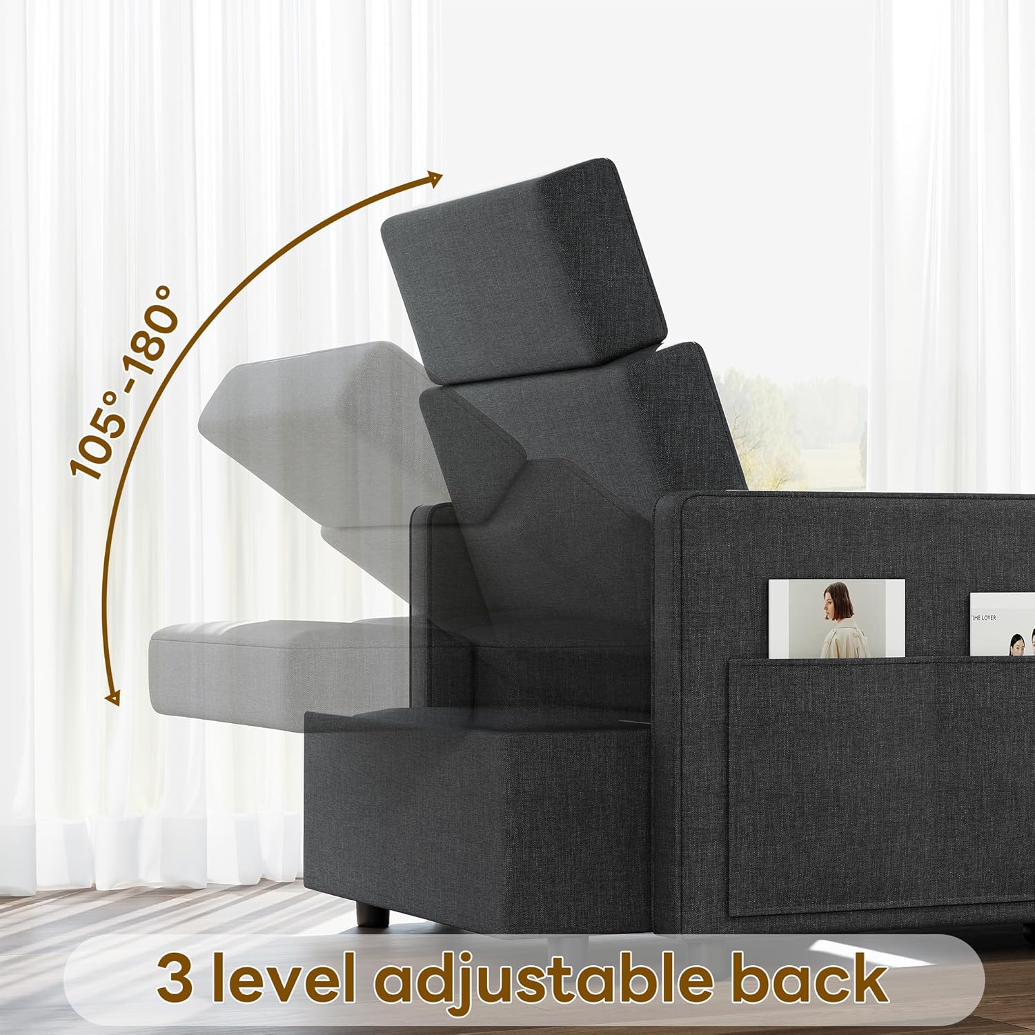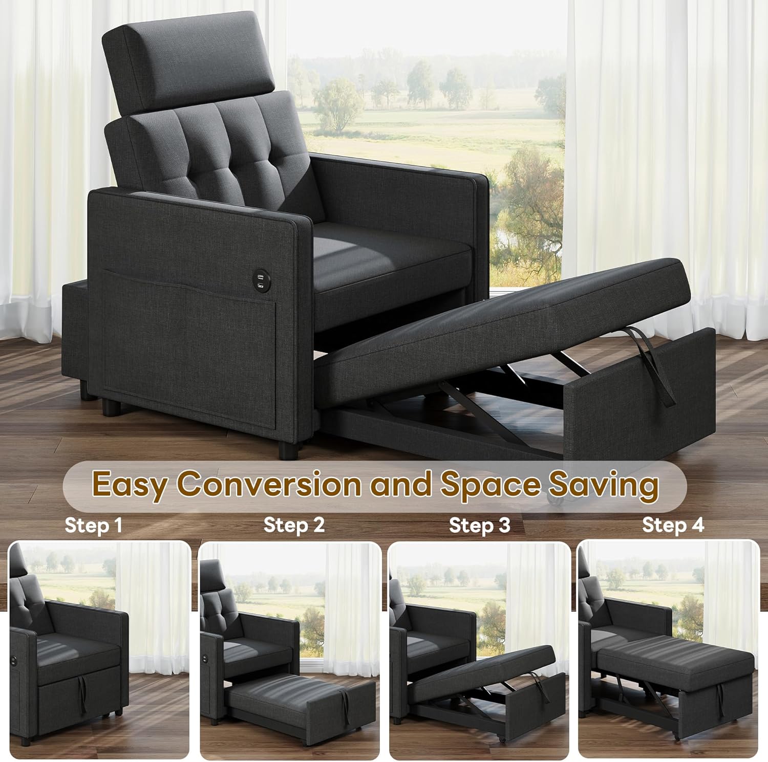 We were immediately impressed by the breathable linen fabric covering this convertible sofa chair. The texture strikes a perfect balance between softness and durability, making it comfortable for daily use while resisting ordinary wear and tear. Over several weeks of testing,the material maintained its integrity without showing signs of pilling or color fading,even with frequent adjustments and conversions between chair,sleeper,and chaise longue modes.The dark grey tone helps to mask minor stains and is easy to clean, which is a big plus for small living spaces where spills can happen unexpectedly.