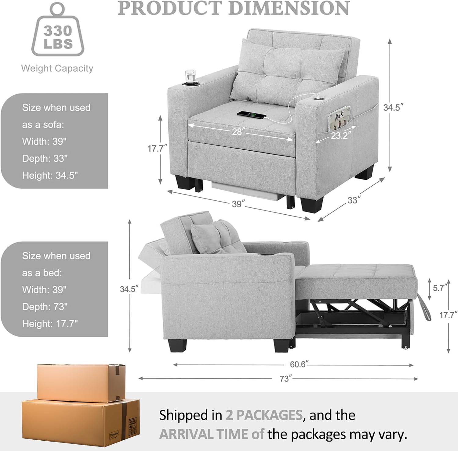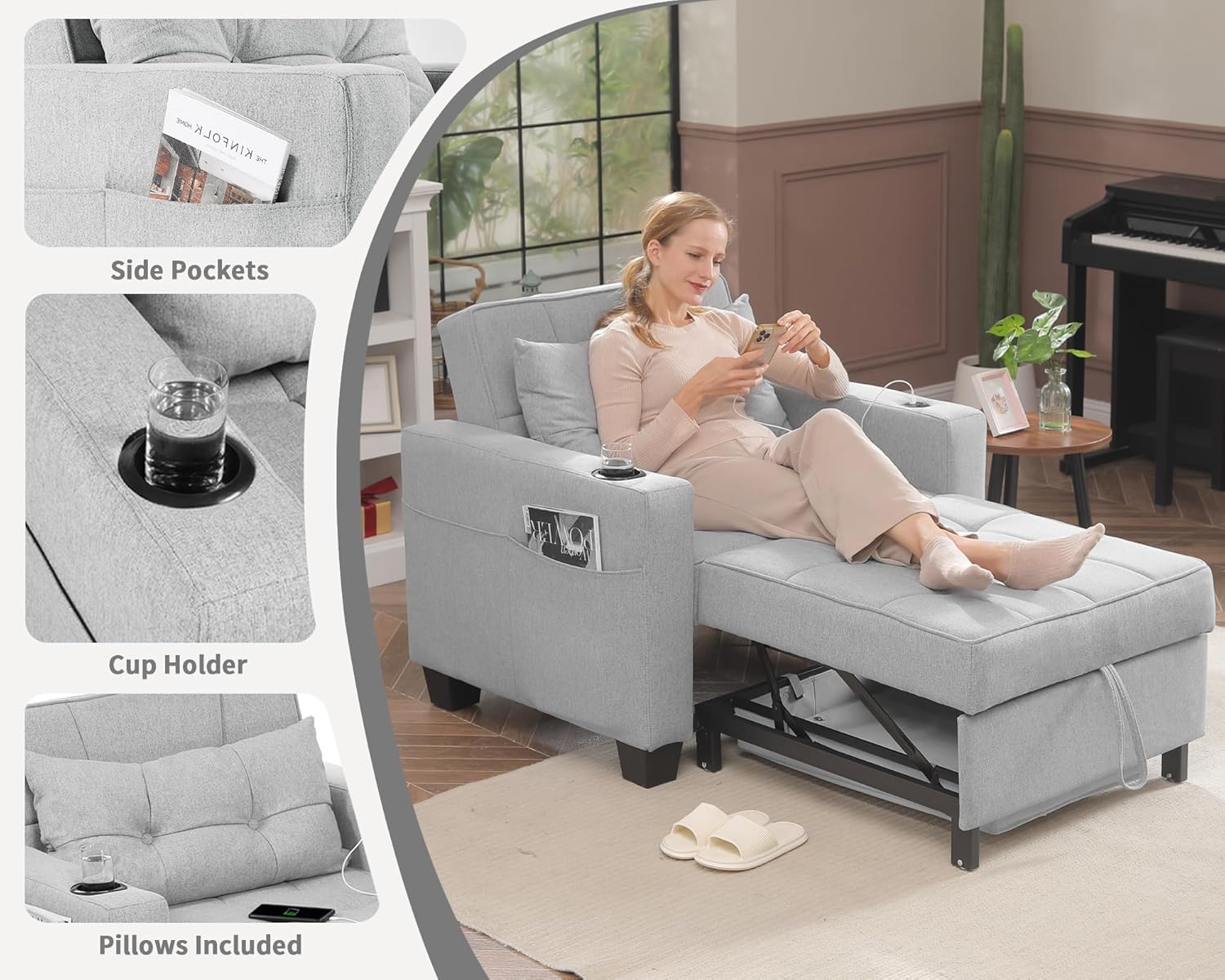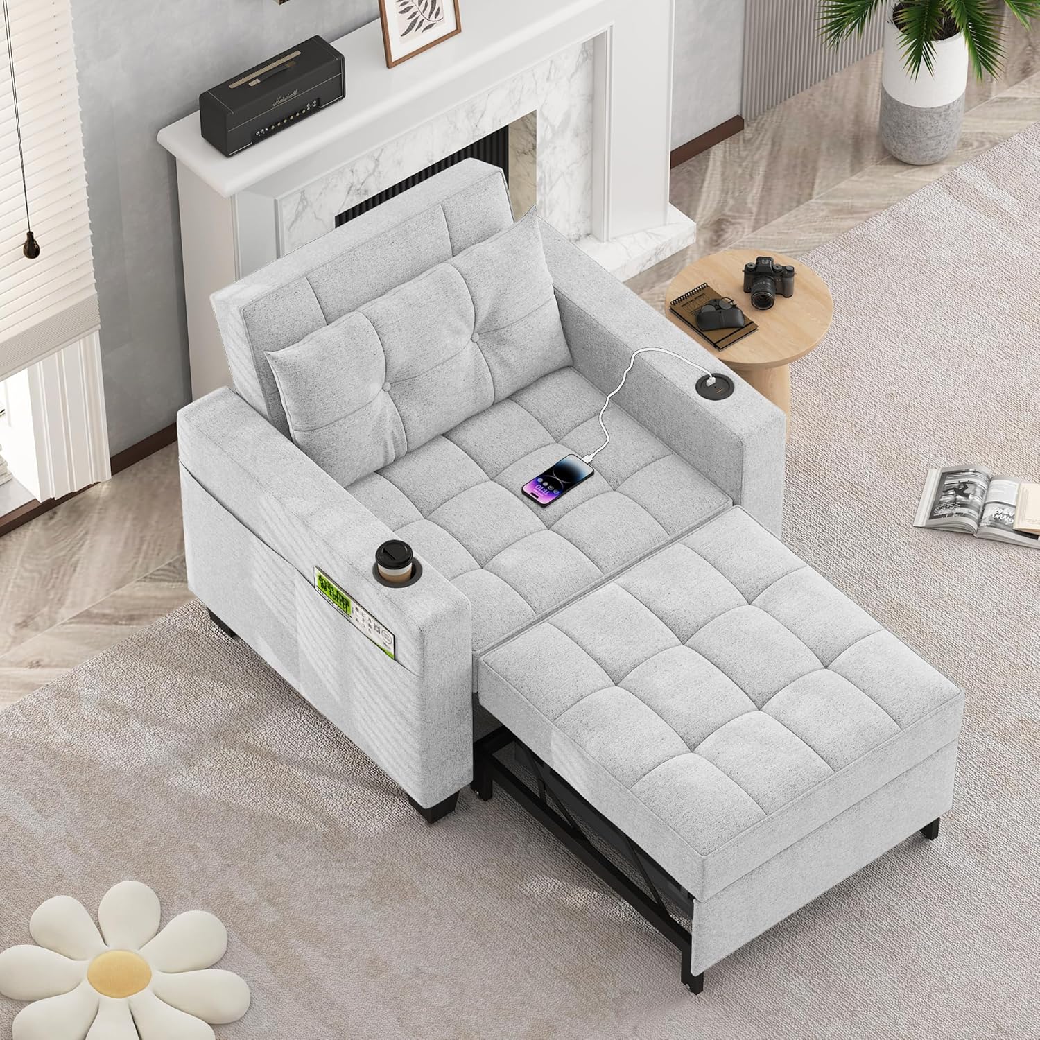 After spending time with this versatile piece, we can confidently say it excels in combining functionality with comfort, especially for those juggling limited space. Its seamless transformation from an accent chair to a chaise lounge, and then into a sofa bed, makes it an excellent choice for apartments, offices, or any setting where space-saving solutions are a priority. The adjustable backrest with three distinct reclining angles allows us to relax in just the way we like-be it reading, watching TV, or napping.Plus, built-in conveniences like USB charging ports and a cup holder make lounging effortlessly enjoyable without the need for extra tables or outlets.