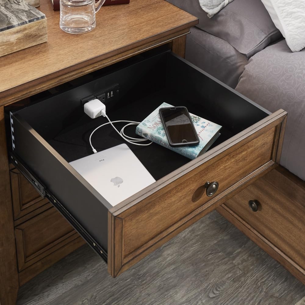 what truly elevates this piece is the built-in charging station integrated discreetly in the top drawer. Featuring two electrical outlets and two USB ports, it keeps our devices powered and cord-free, eliminating the hassle of crowded outlets or unsightly cables across the bedroom. Paired with the classic aesthetic and multiple finish options, it blends seamlessly into our bedroom decor, serving both style and function. Below is a quick overview highlighting the key organizational features that make this nightstand a must-have for creating a serene and clutter-free sleeping space:
