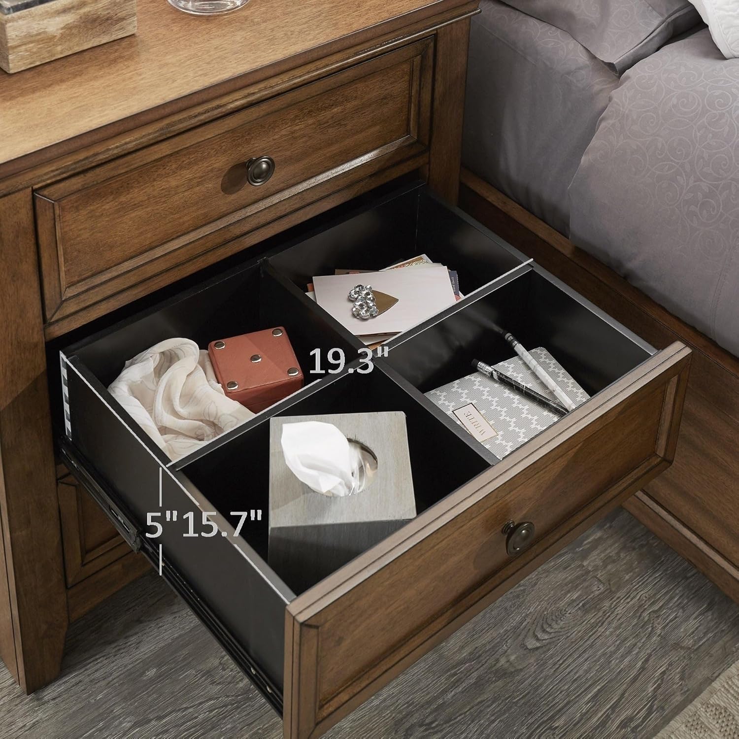 Practicality is at the forefront, with three spacious drawers providing generous storage, while modular dividers enhance institution within two of them.The top drawer stands out for its built-in dual electrical outlets and USB ports, allowing us to conveniently charge devices overnight without cluttering the surface. Smooth full-extension ball bearing drawer glides ensure seamless access, while the sturdy French dovetail construction guarantees lasting durability. Below is a quick snapshot of its key dimensions and features for easy reference: