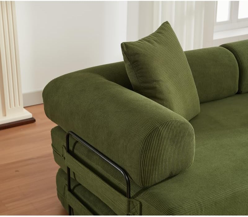 from the moment we unpacked this versatile piece, it’s clear the design prioritizes both style and function. The modular 4-in-1 concept lets us switch effortlessly between a 3-seater sofa, a lounger, a daybed, and a king-size sleeper without any tools or complicated setup. the soft corduroy fabric immediately feels inviting, while the plush throw pillows add an extra touch of coziness.Its compact footprint when folded makes it a smart addition for tight living spaces or guest rooms, and the rolled armrests provide a subtle elegance that fits both modern and cozy decors.