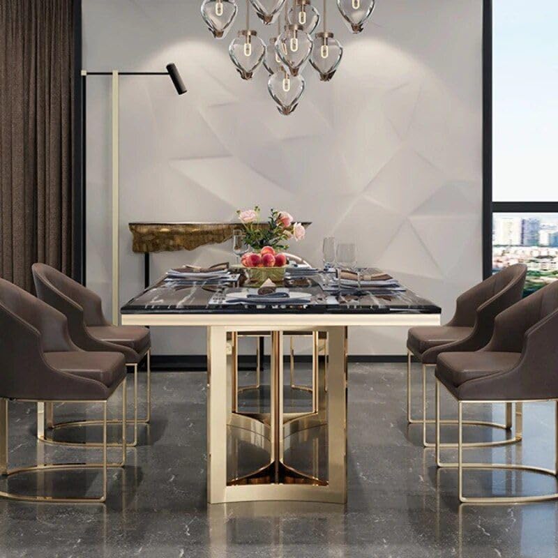 To maximize both the aesthetic appeal and functionality of this luxurious dining table, we suggest placing it in a well-lit, open dining area where its light marble surface and gold accents can truly shine.Position it near large windows or subtle ambient lighting to highlight its sleek Nordic design without overwhelming the space. Pairing it with minimalist chairs in neutral tones such as soft grays, whites, or muted earth colors complements the table’s modern Scandinavian vibe, creating a cohesive and serene atmosphere. Avoid overly ornate seating that may detract from the table’s clean lines and understated elegance.