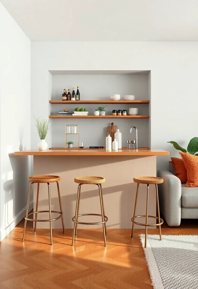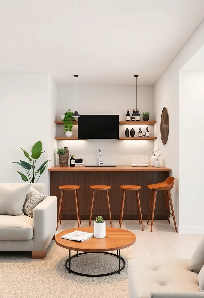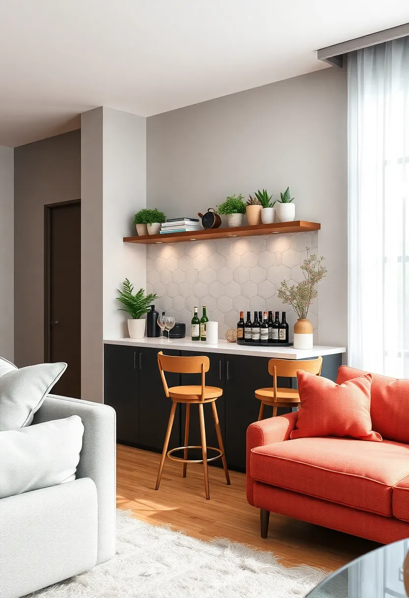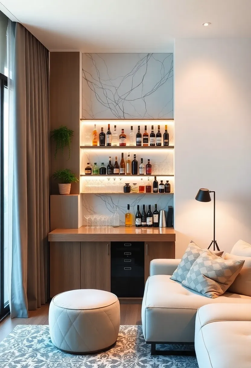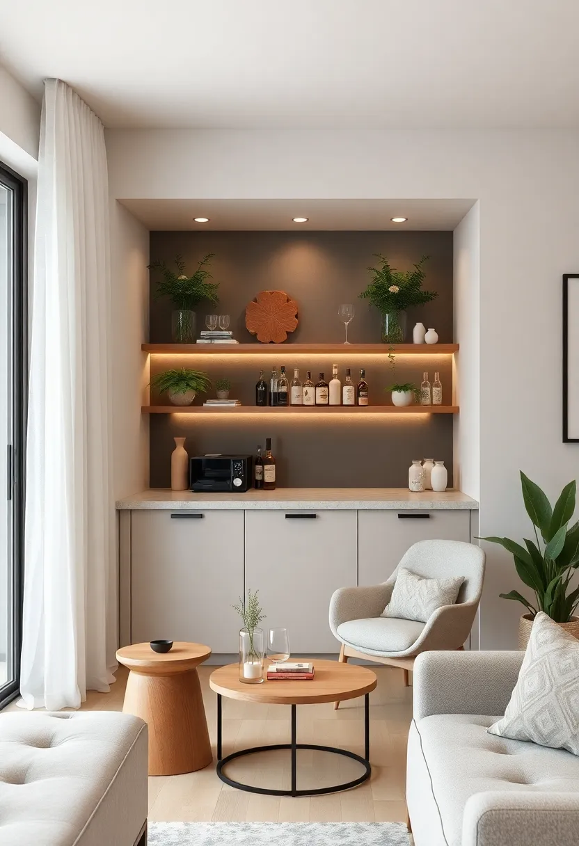 Transform your small living room into a stylish bar by utilizing wall-mounted shelves to display your favorite spirits. These shelves not only save precious floor space but also create a visually appealing focal point in the room. You can opt for minimalist designs that feature clean lines or go for rustic wooden options that bring warmth and character. Arrange your bottles by height, brand, or color to add an artistic touch, and consider including decorative elements like cocktail shakers or unique glassware to elevate the overall aesthetic.