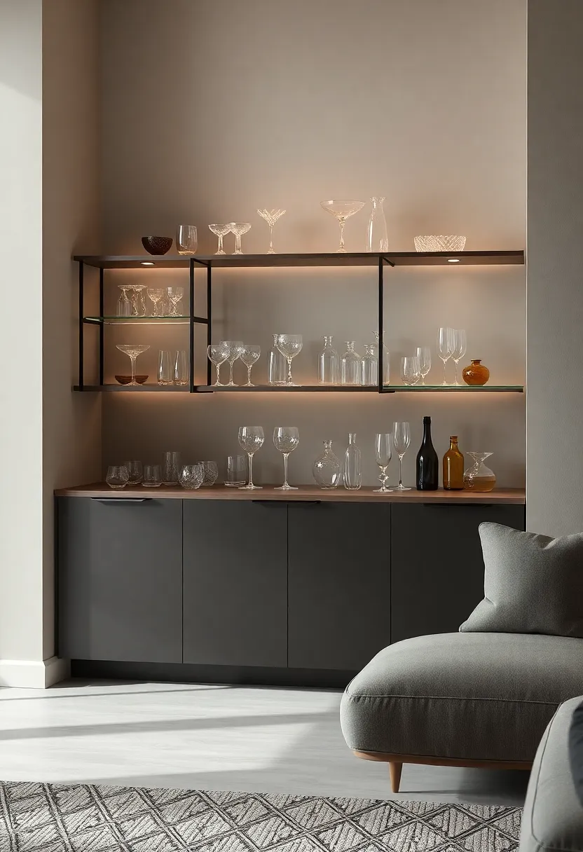Transform your small living room bar into a stunning focal point by showcasing your glassware in a way that captivates attention. Consider using vertical space by installing floating shelves or a stylish wall-mounted rack. Arrange your favorite glassware, such as crystal champagne flutes and uniquely shaped whiskey tumblers, to create an engaging display.You can infuse personal touches by incorporating decorative elements like small potted plants, funky coasters, or even colorful cocktail books that not only occupy space but also invite curiosity.