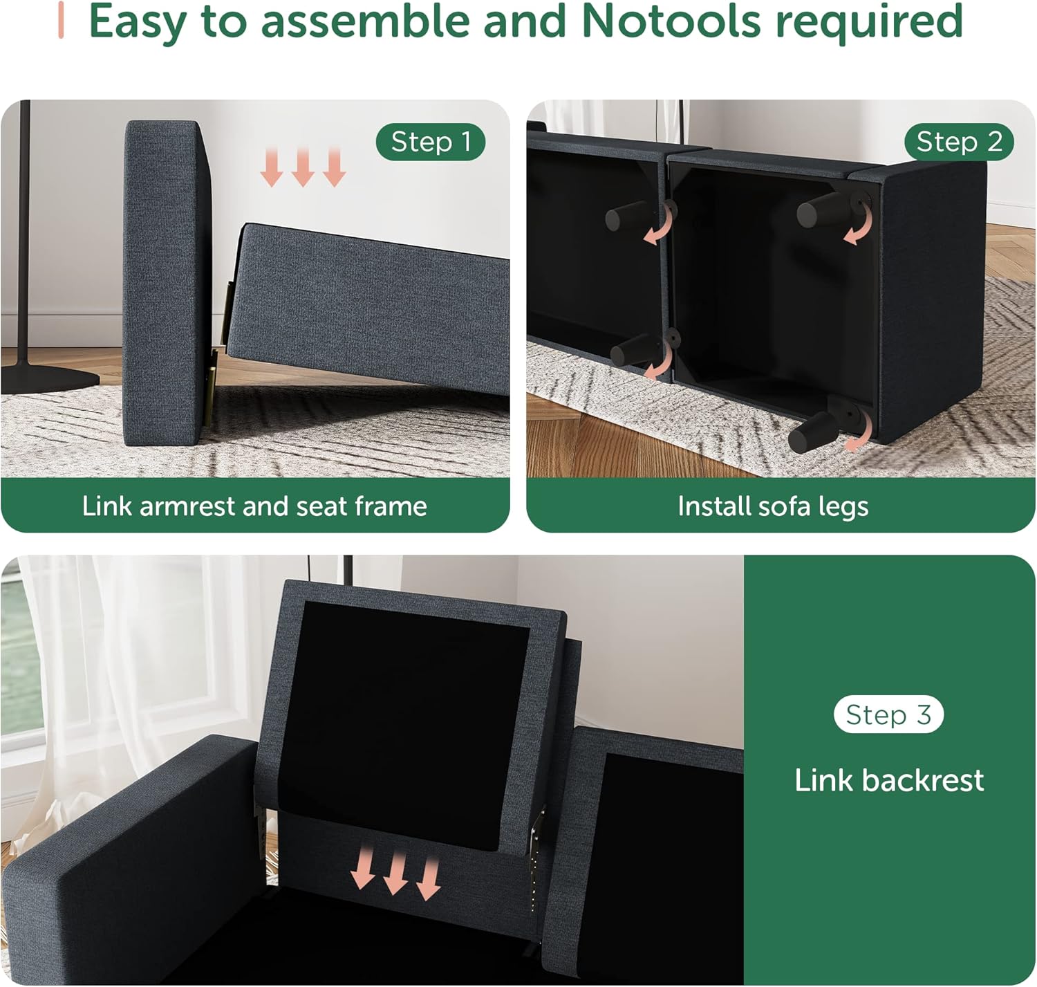 Setting up this sectional was remarkably straightforward and stress-free.Delivered in just three separate packages, each component arrived securely packed, making the unboxing smooth and hassle-free. The best part is that no tools were required for assembly, which is a huge plus for those who dread complex setups. Clear, step-by-step instructions guided us effortlessly through the process, and we appreciated how the reversible chaise design allowed us to tailor the configuration to fit our space perfectly. All pieces fit together snugly without any noticeable gaps or misalignments,showcasing thoughtful engineering and design.