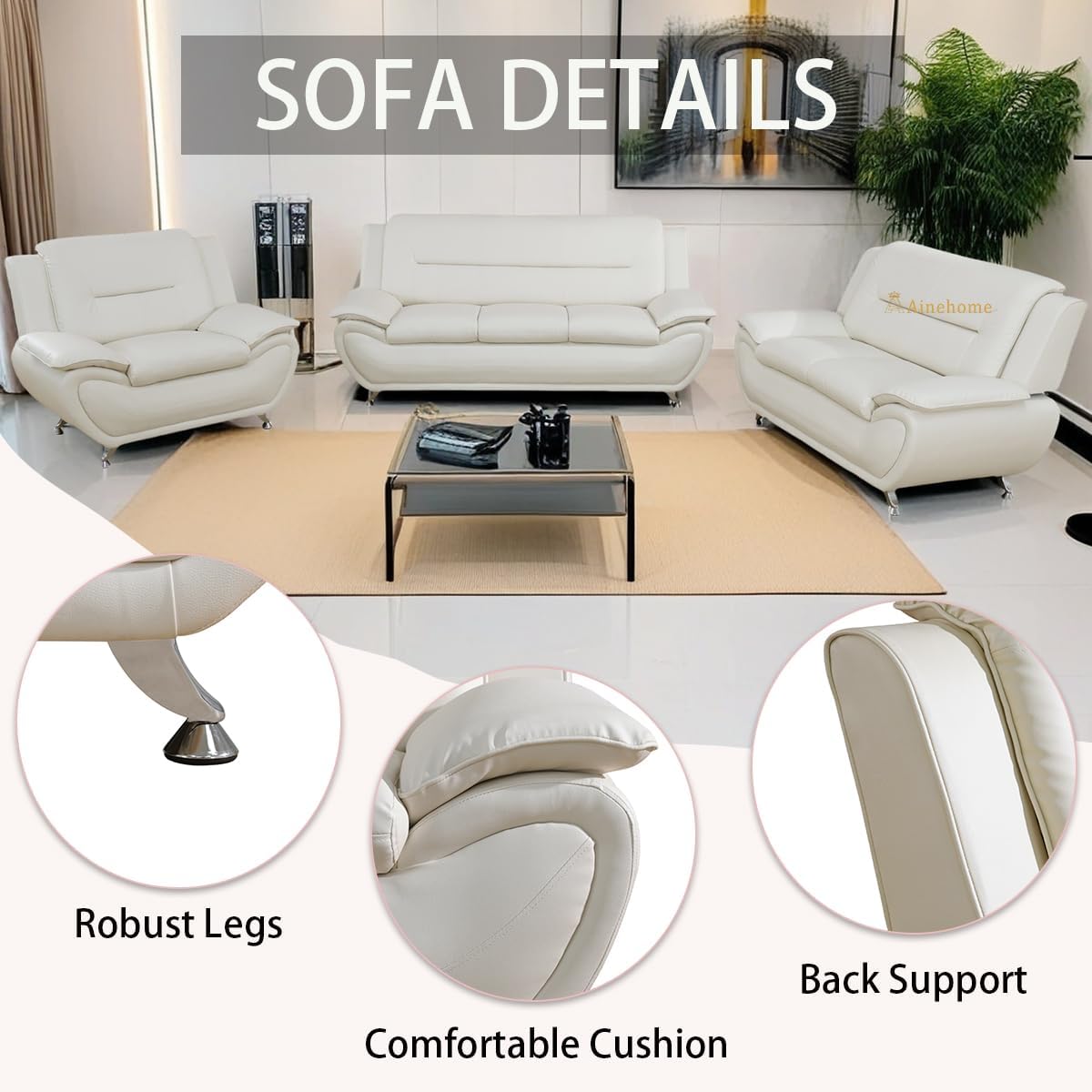 From the moment we unpacked this modern, creamy white faux leather sectional, it was clear that it would become a central element in our living space.The set, consisting of a sofa, loveseat, and chair, offers ample seating with a sleek design that fits perfectly in contemporary homes. The soft upholstery not only feels pleasant to the touch but also meets important flammability standards, which gives us peace of mind in terms of safety.The cushions provide a comfortable yet supportive experience, suitable for both lounging and entertaining guests.