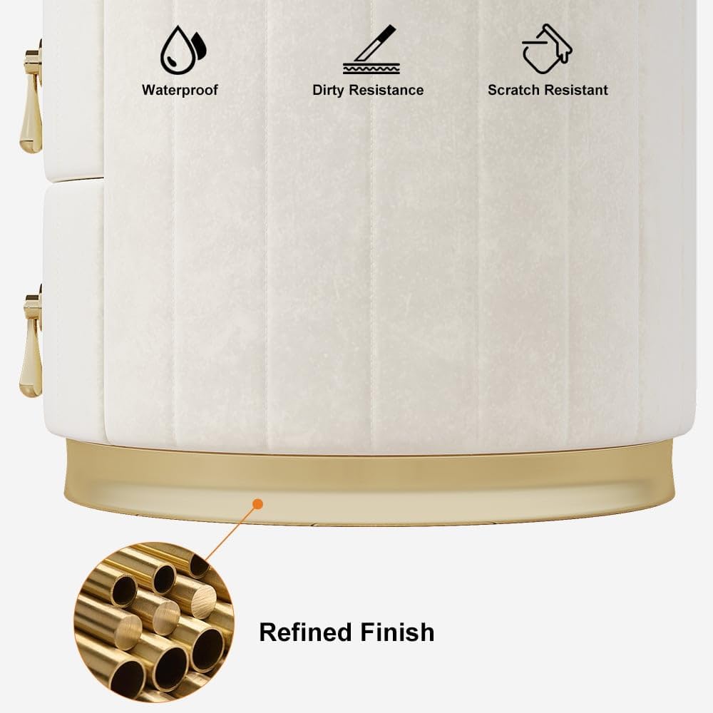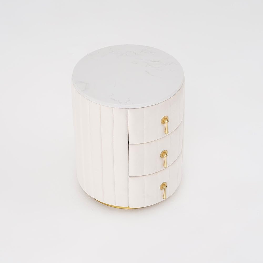 After spending time with this piece, we believe it’s an excellent choice for those seeking a blend of style, practicality, and durability. Its three spacious drawers offer ample storage, making it easy to keep night essentials, accessories, and more neatly tucked away. The sintered stone top stands out for its scratch resistance and easy maintenance-perfect for holding anything from a bedside lamp to a glass of water without worry.The elegant round design with premium white velvet upholstery adds a touch of sophistication that complements various décor styles,whether in a bedroom or living area.
