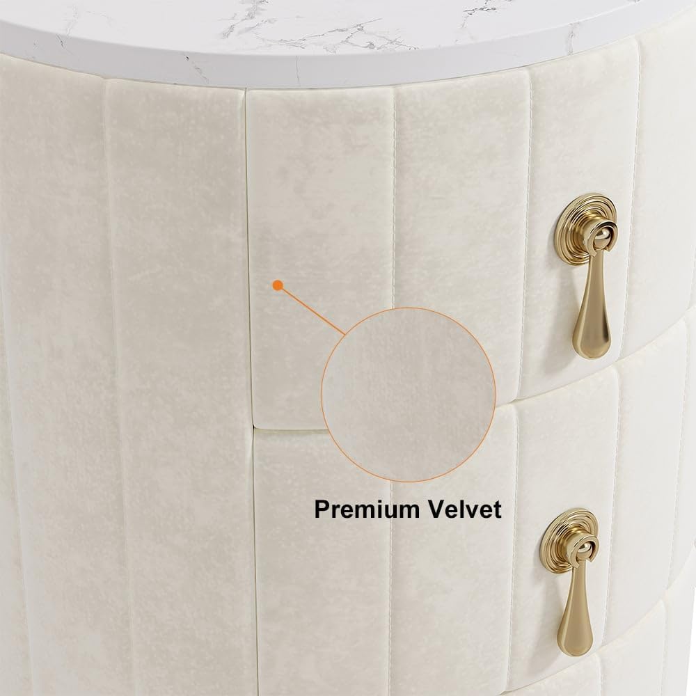 We found this piece to be an exceptionally adaptable addition to both bedroom and living spaces. Its sleek round silhouette combined with a soft velvet finish brings a touch of modern elegance that seamlessly blends with various décor styles.In the bedroom, the three spacious drawers provide an excellent solution for storing essentials such as books, cosmetics, and nighttime accessories, helping keep clutter at bay while maintaining a refined look. The durable sintered stone top is not only visually appealing but also scratch-resistant and easy to clean, making it perfect for holding bedside lamps, photo frames, or even nighttime beverages without worry.