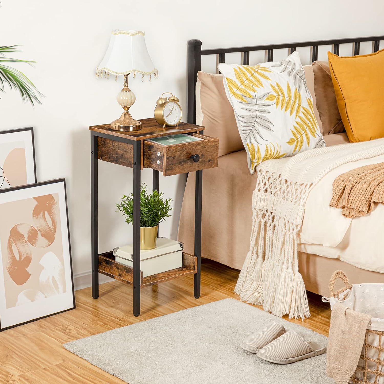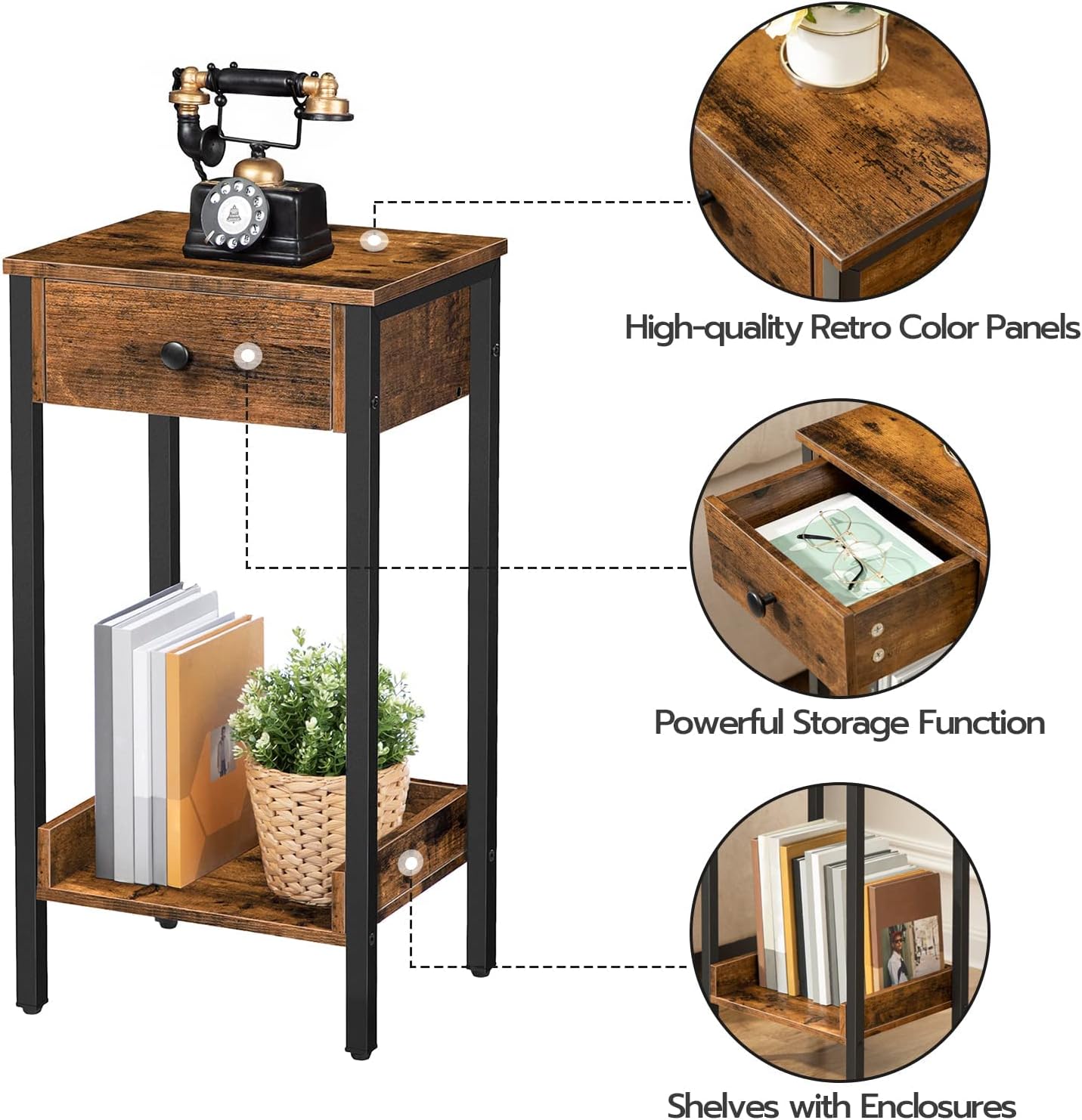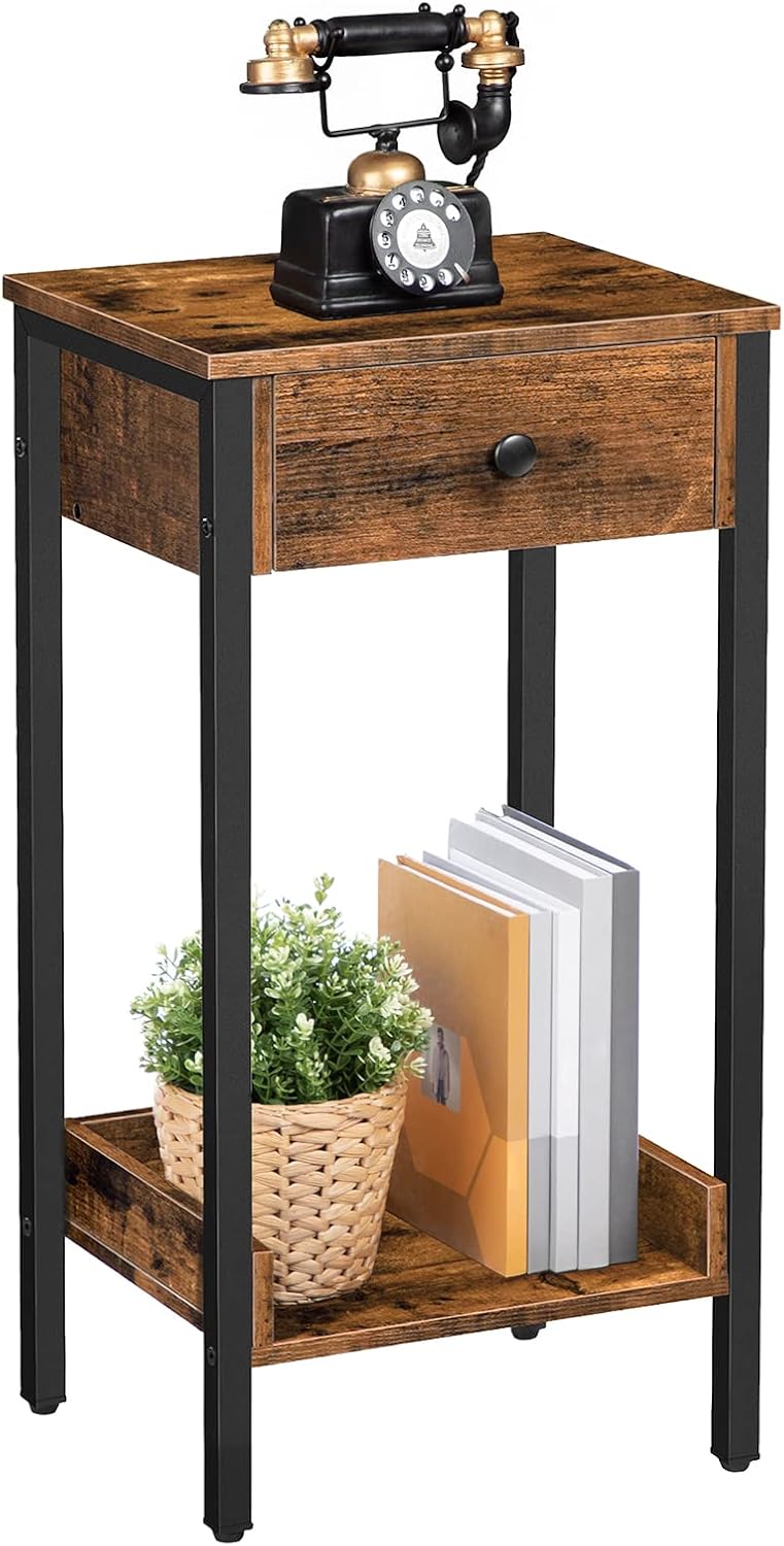 When considering value, this piece stands out as a versatile and space-saving solution suitable for a variety of rooms and functions. Its compact footprint (11.2″ x 13.8″ x 27″) makes it ideal for tight corners, whether beside a bed, sofa, or hallway.The combination of an industrial-style metal frame with rustic brown panels adds a trendy touch without overwhelming your décor. Practicality is also front and center: the drawer provides extra storage while the enclosed shelves prevent items from falling, making it perfect for storing books, office supplies, or nighttime essentials.
